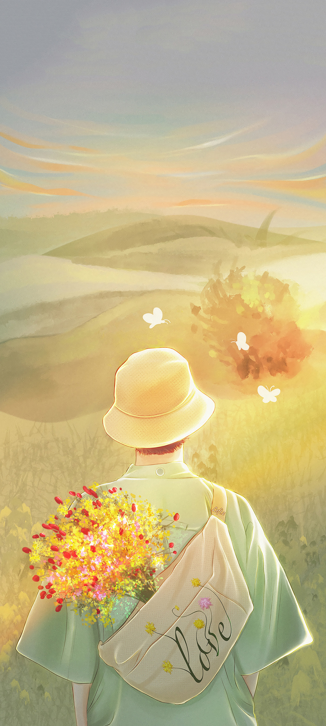 男孩帽子背影鲜花情侣手机壁纸免费下载