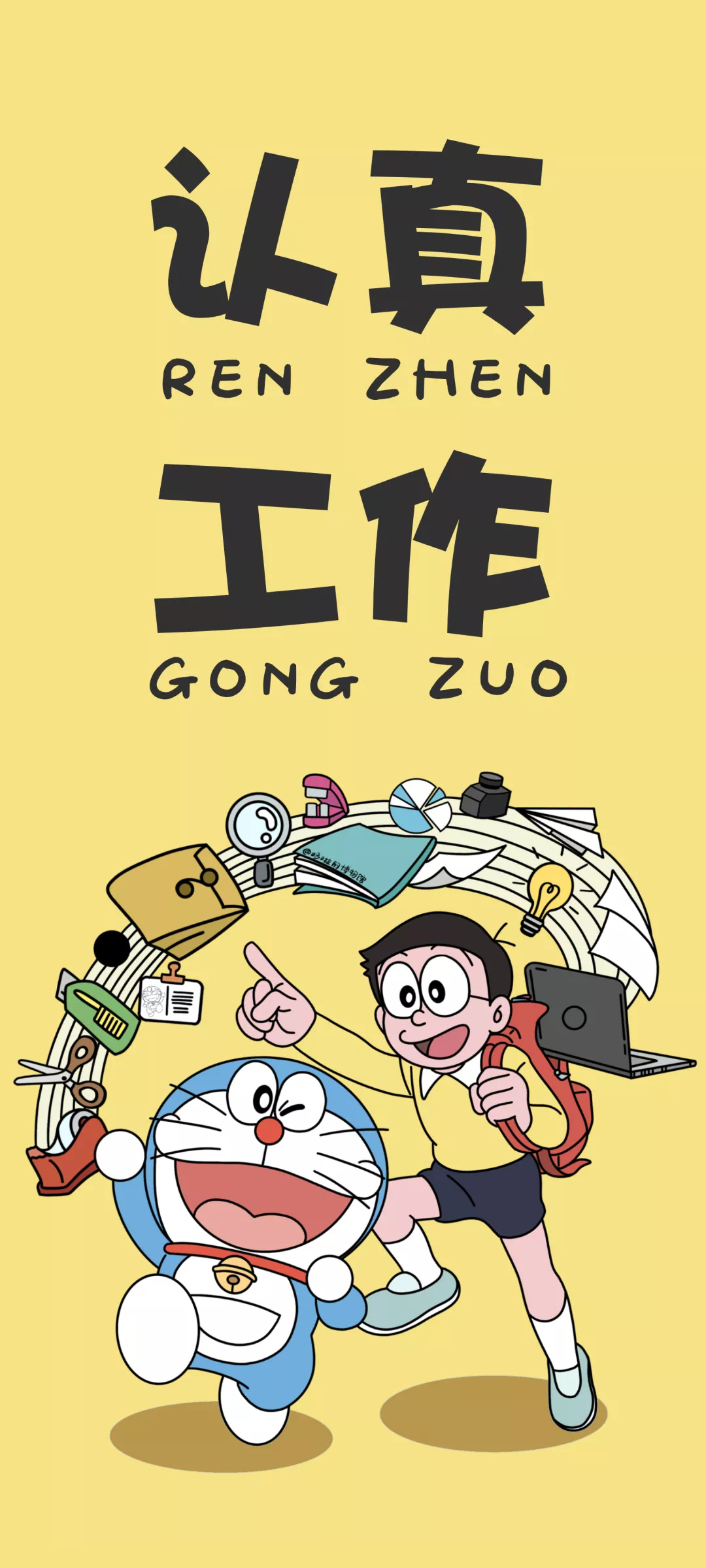 认真工作主题哆啦A梦文字手机壁纸免费下载