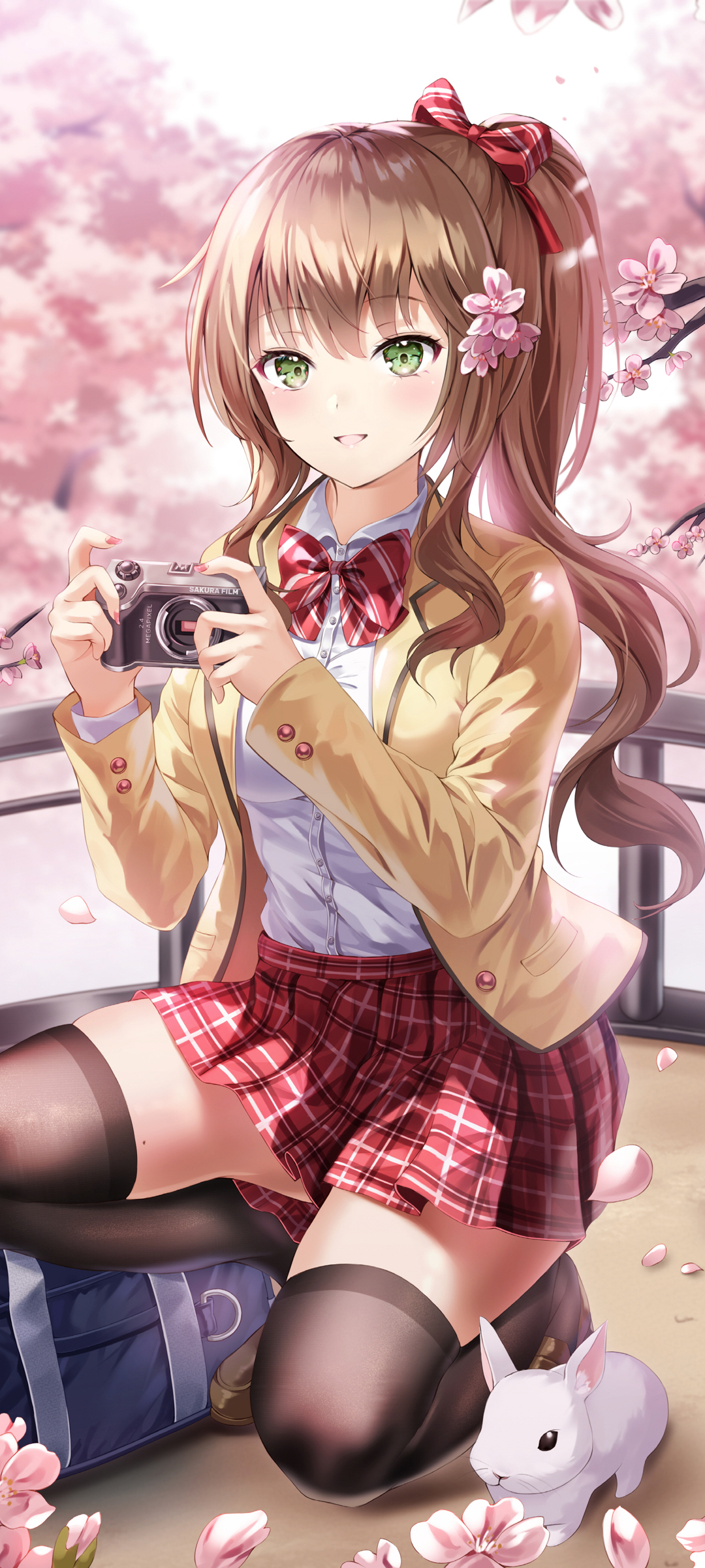 樱花 桜 马尾辫 红色短裙 黑色裤袜 相机 动漫美女手机壁纸