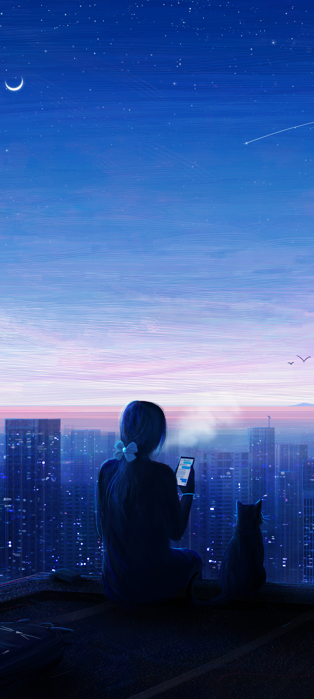 夜晚 星空 月亮 女孩 猫 全面屏手机壁纸