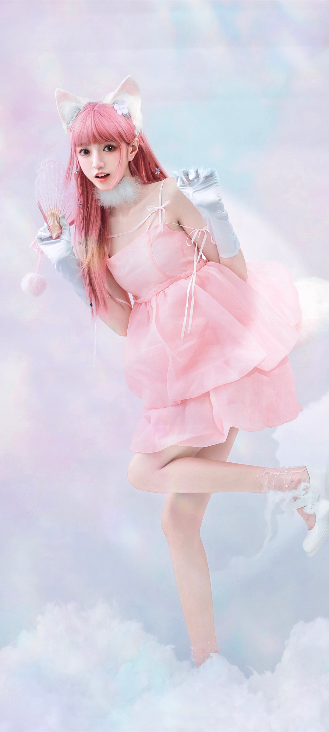 鹿醒唯美美女穿粉色裙子戴耳朵饰物云背景手机壁纸免费下载