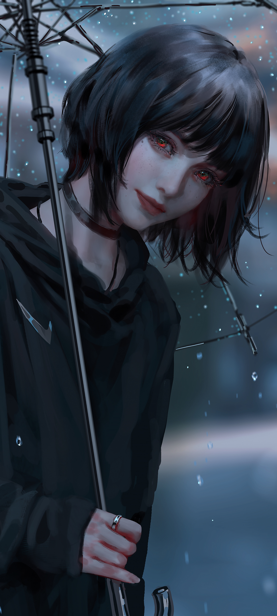 雨天 黑色运动装美女 透明雨伞 动漫美女手机壁纸