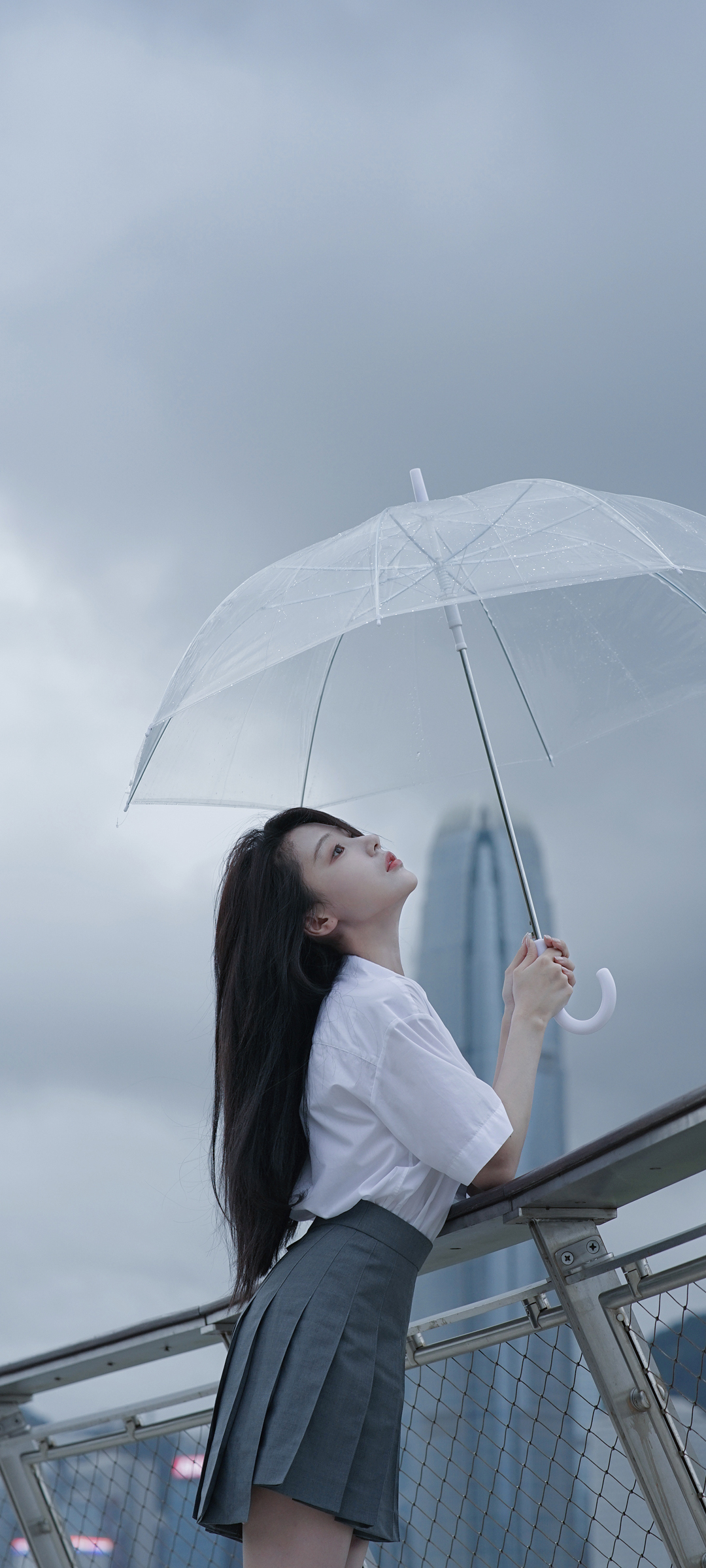 美女 白色衣服 百褶裙 透明伞 全屏手机壁纸