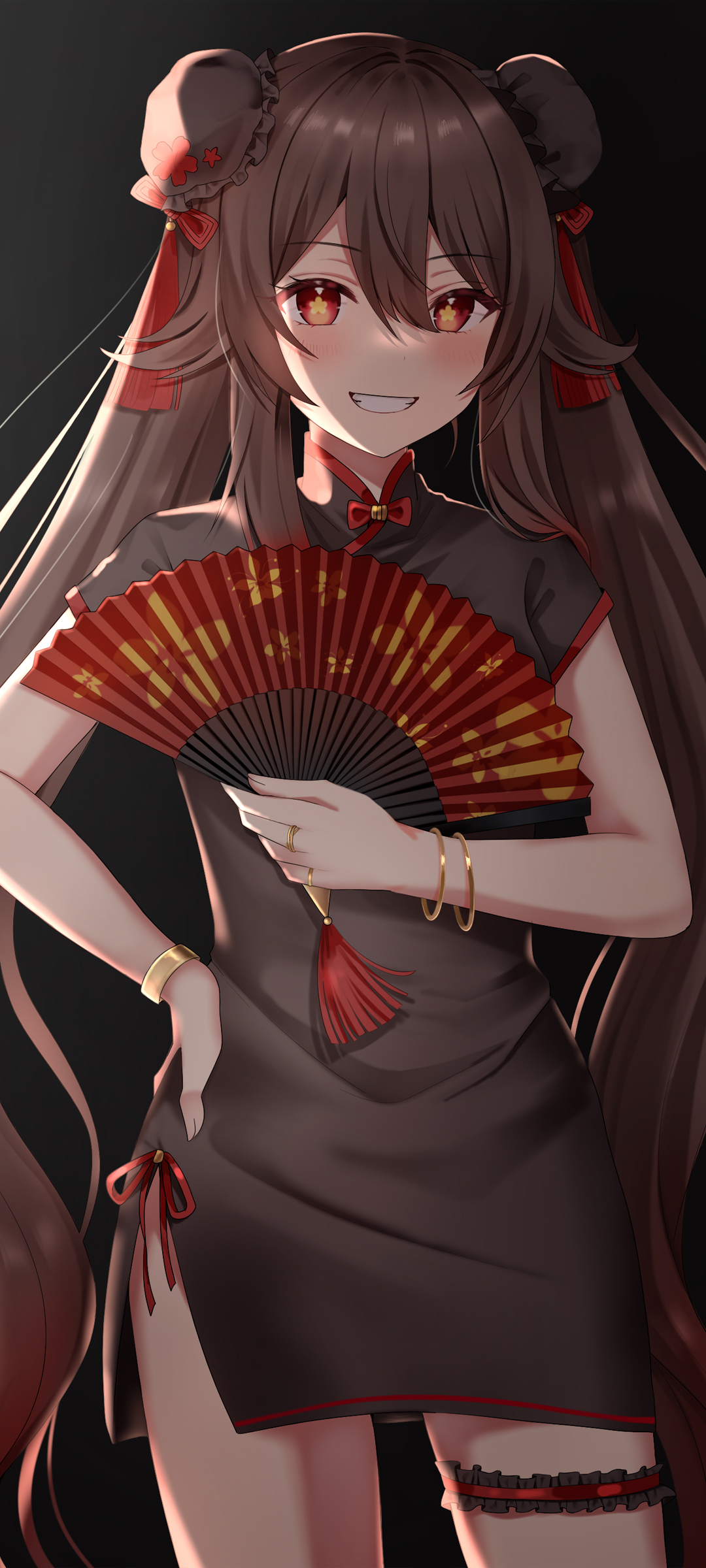 原神胡桃黑色旗袍持扇动漫全屏手机壁纸免费下载