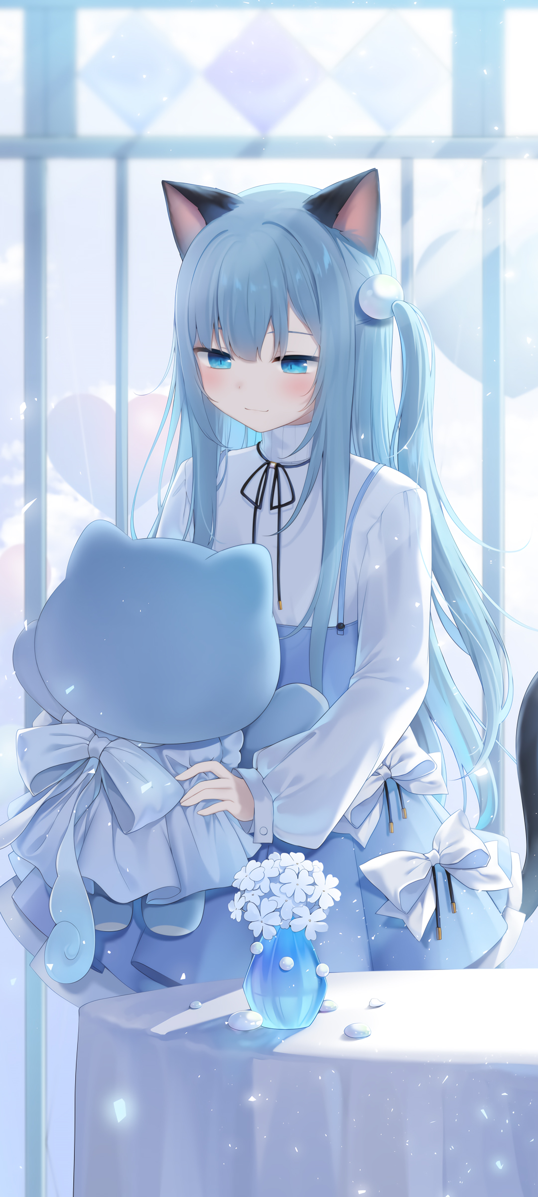 猫羽雫可爱少女动漫手机壁纸 猫耳蓝色眼睛配花毛绒玩具免费下载
