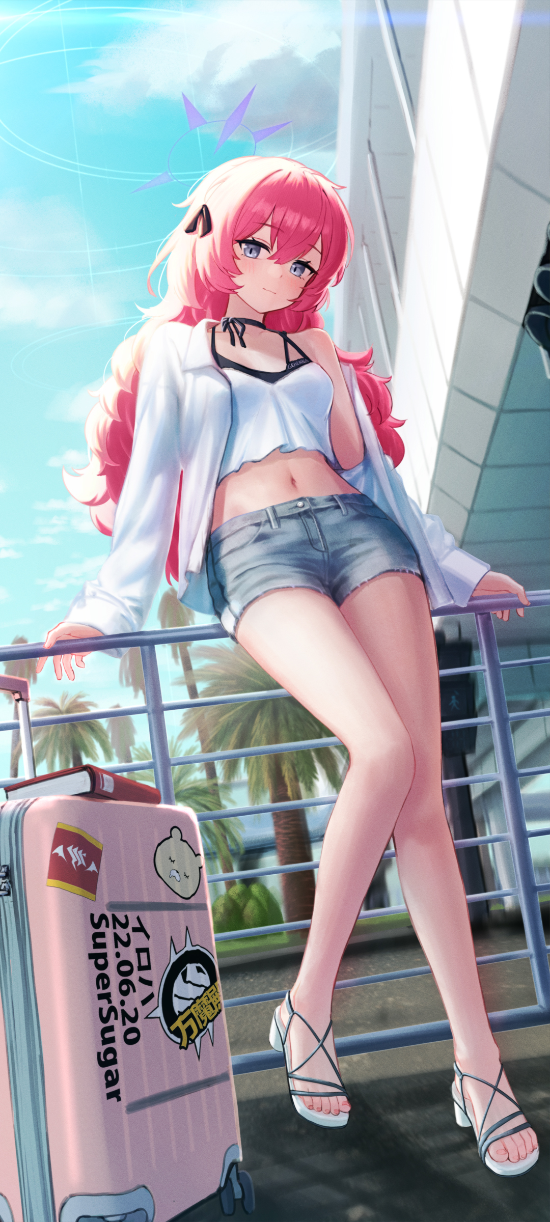 夏天 红色头发女孩 牛仔短裤 行李箱 栏杆 动漫手机壁纸图片