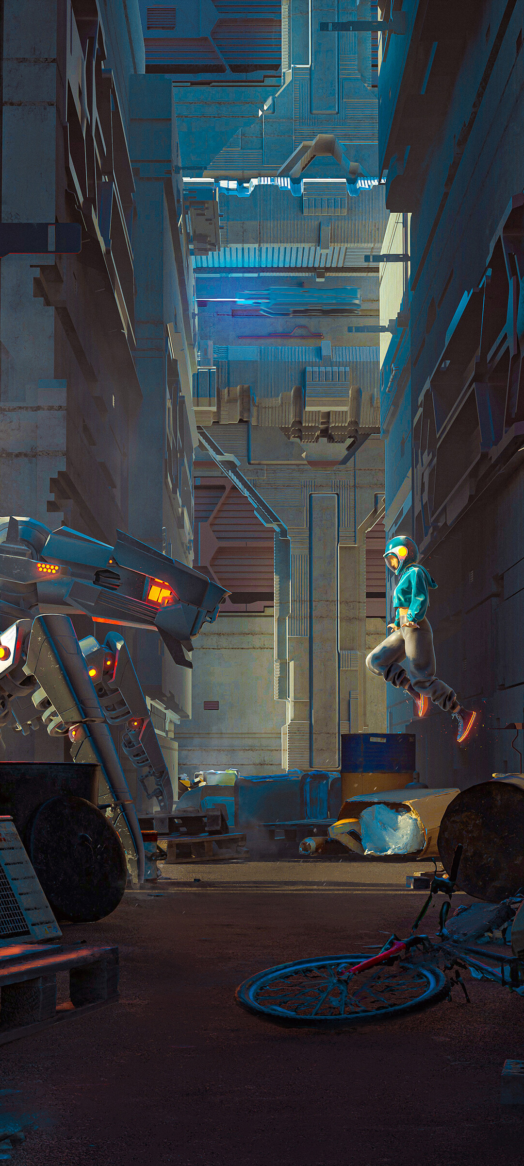 未来科幻风,仓库中飞起的人全屏动漫手机壁纸免费下载