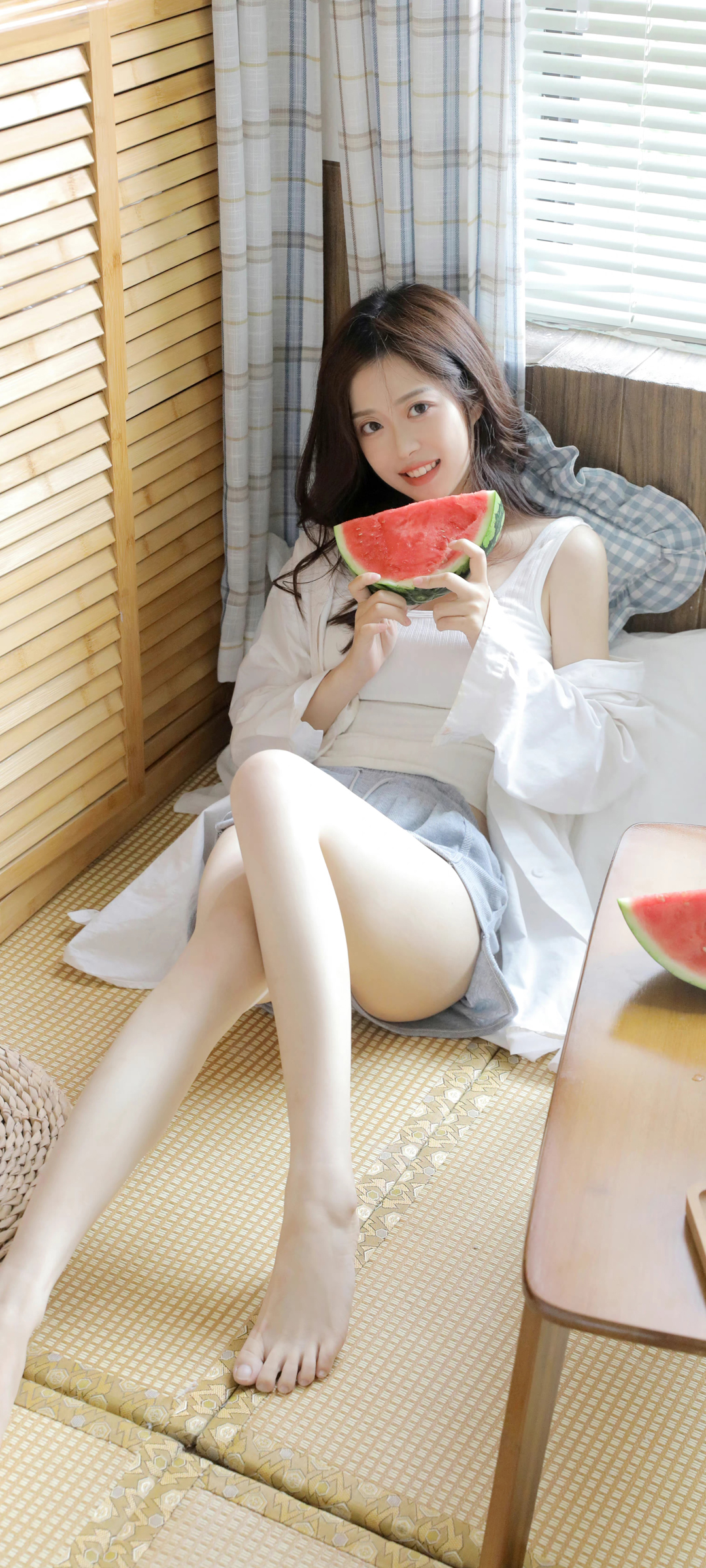 曹婉瑾白色睡衣美女起床全屏免费手机壁纸下载