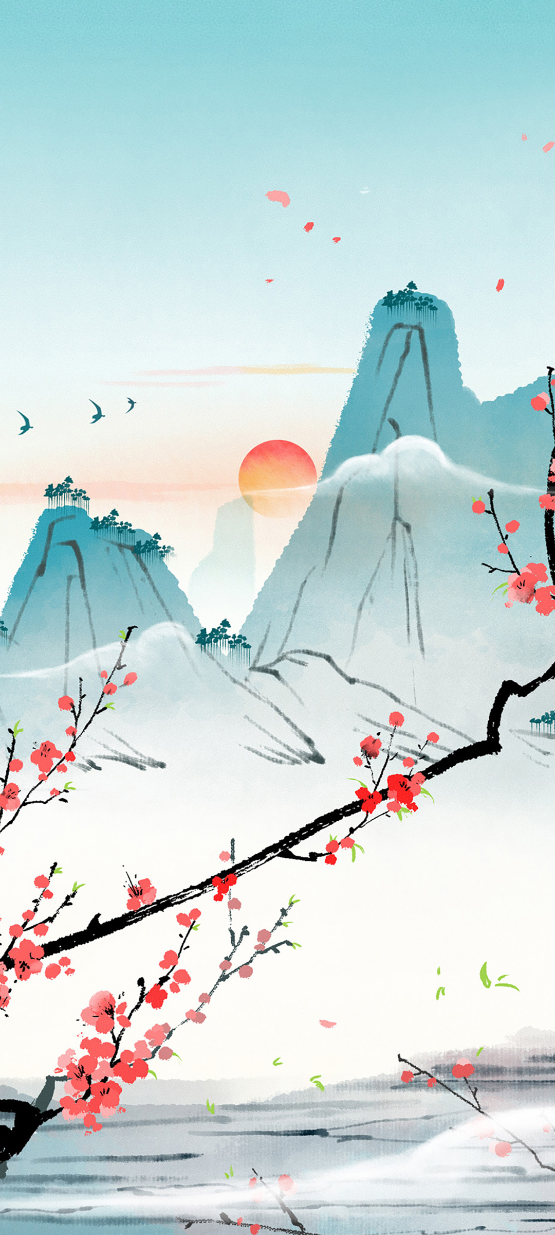 中国风 手绘画风景 山 日出 梅花全屏手机壁纸