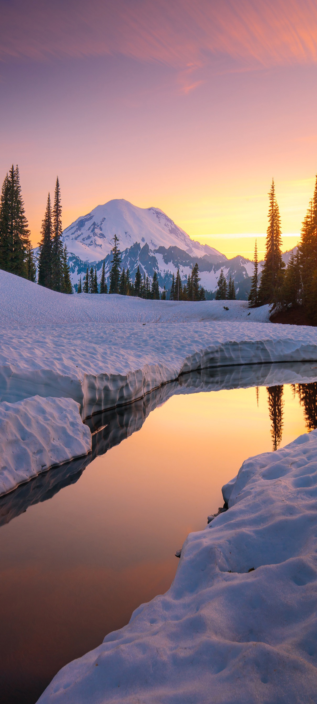 冬天 雪 山 河 树木 夕阳 风景 手机壁纸