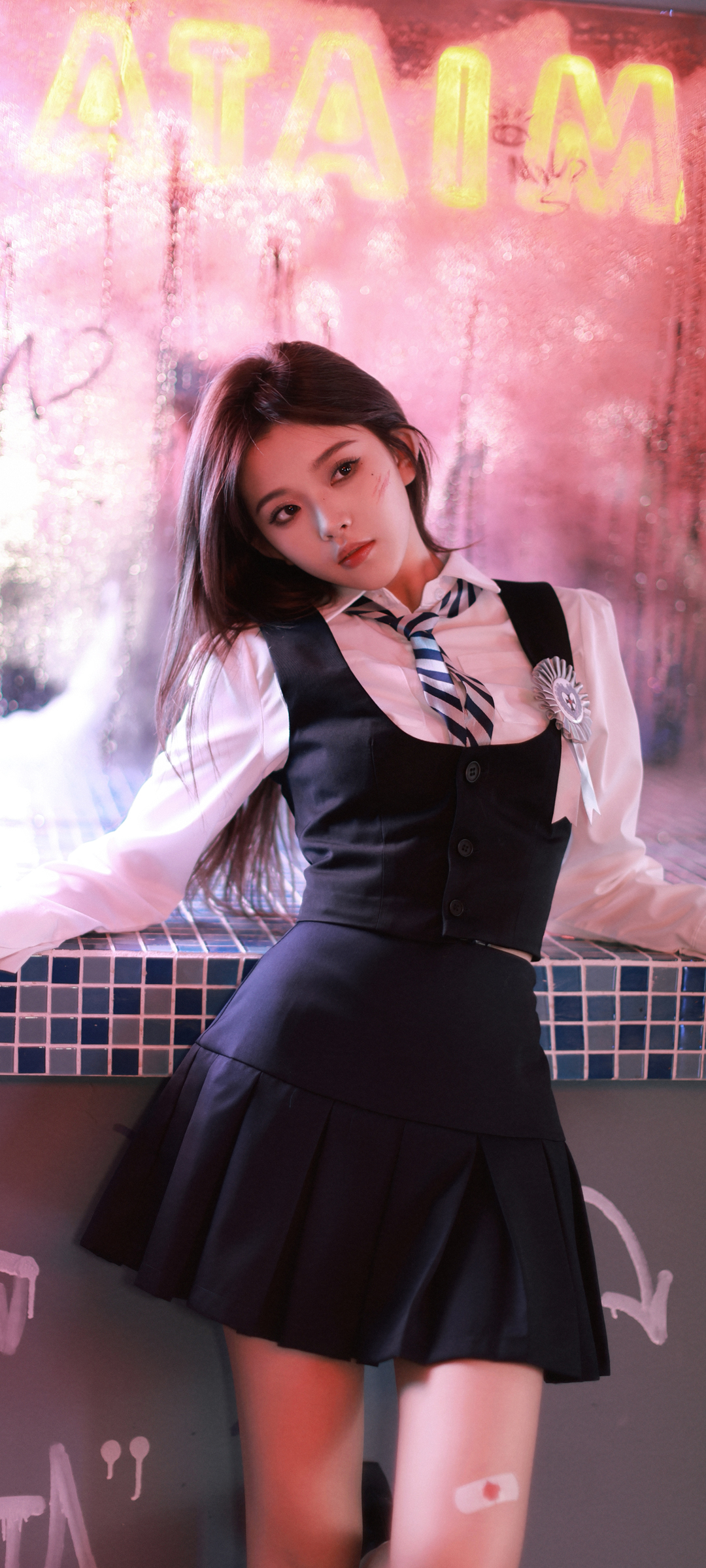 高清 元气 美女 彭十六 长发 美腿 百褶裙 全屏手机壁纸
