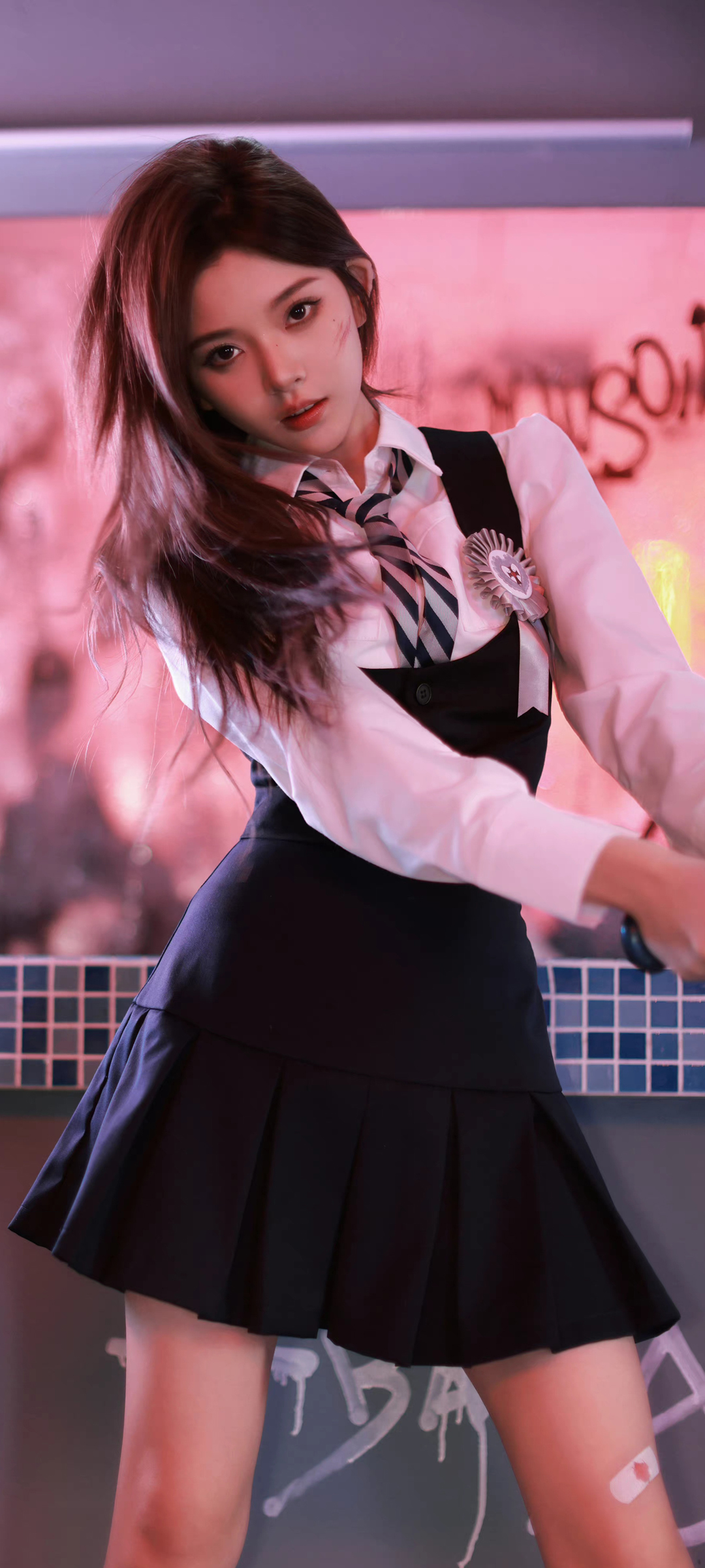 元气美女彭十六黑色百褶裙高清全屏手机壁纸免费下载