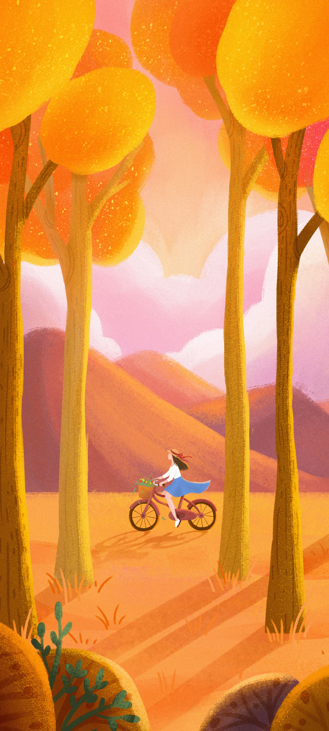 秋天树林女孩单车手绘风景免费手机壁纸下载