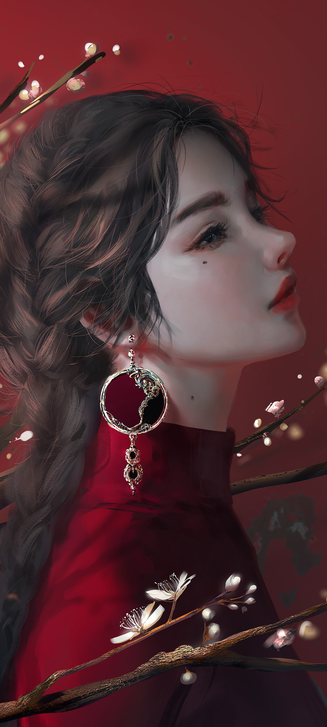 唯美高清动漫壁纸,梅花长辫子女孩配耳环美女手机壁纸免费下载