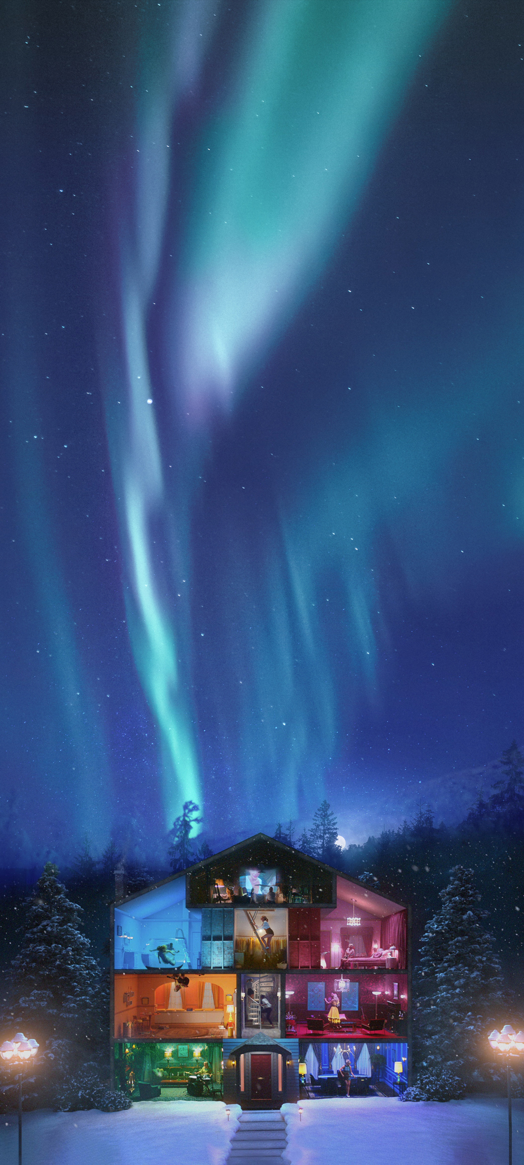 极光 星空 夜晚 房子 雪地 树林 手机 风景 壁纸