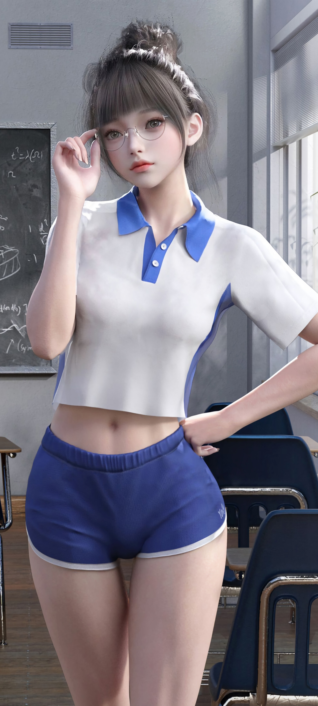yoly莜莉 3D 运动 女孩 眼镜 蓝色短裤 动漫 美女 手机 壁纸