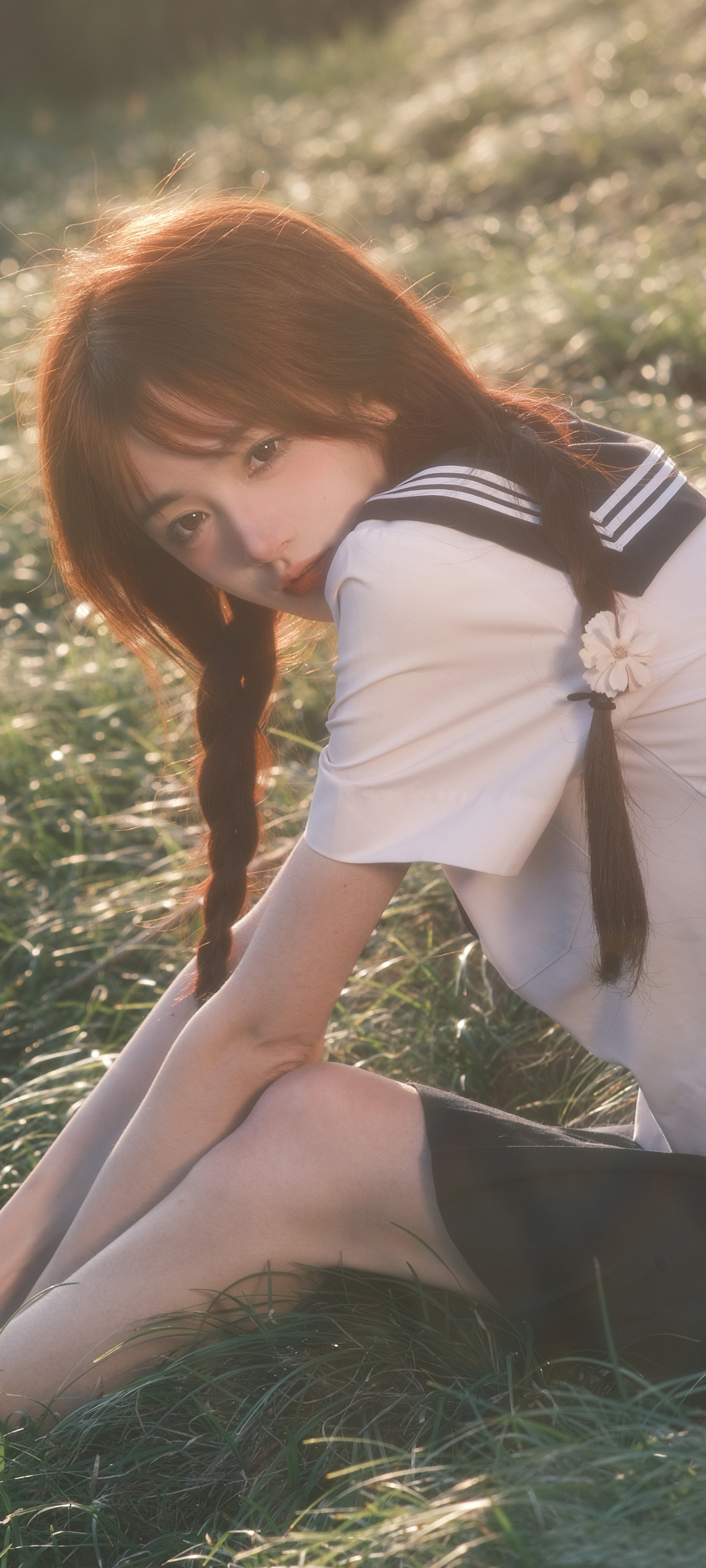 坐草地的美女 双马尾辫 水手服 手机壁纸