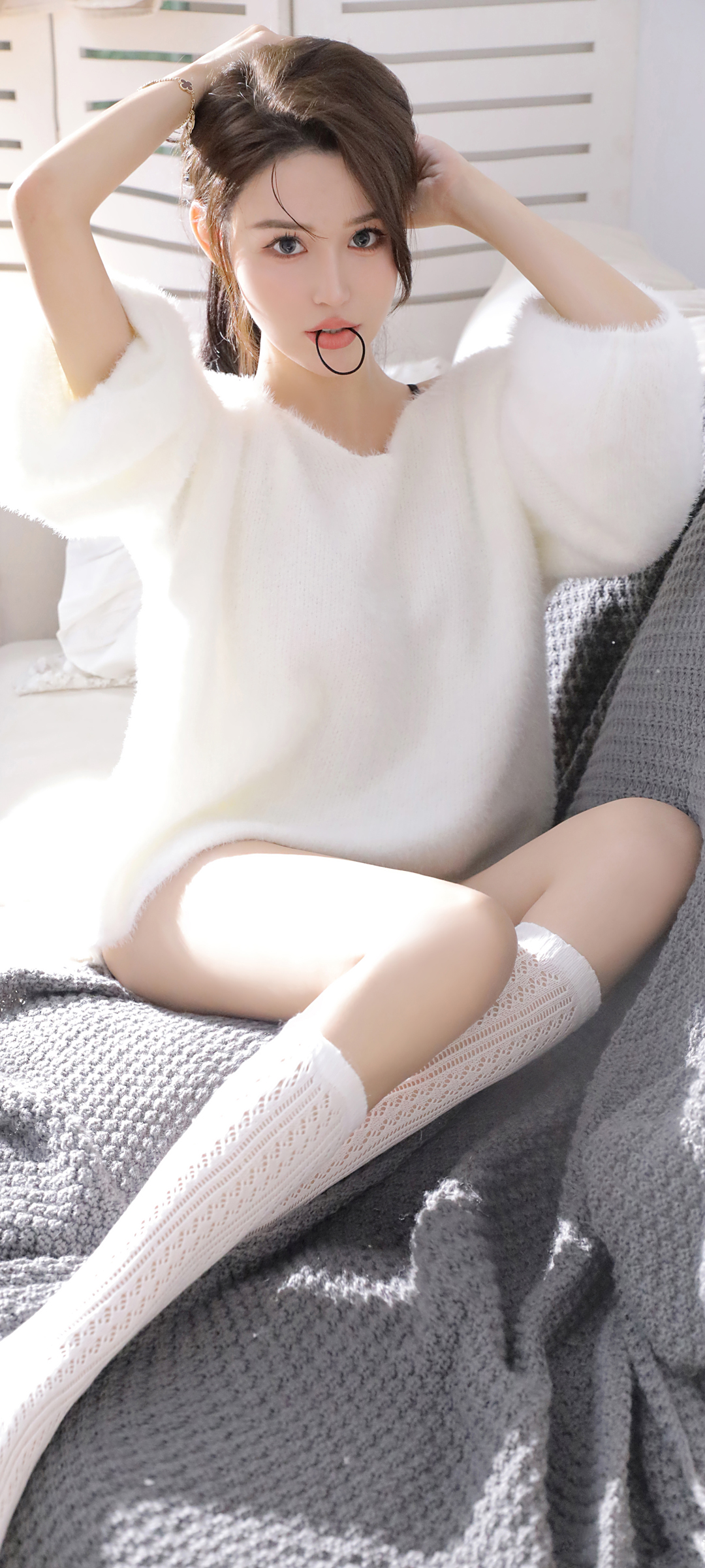 居家养眼美女穿白色毛衣扎头发秀美腿 手机壁纸免费下载