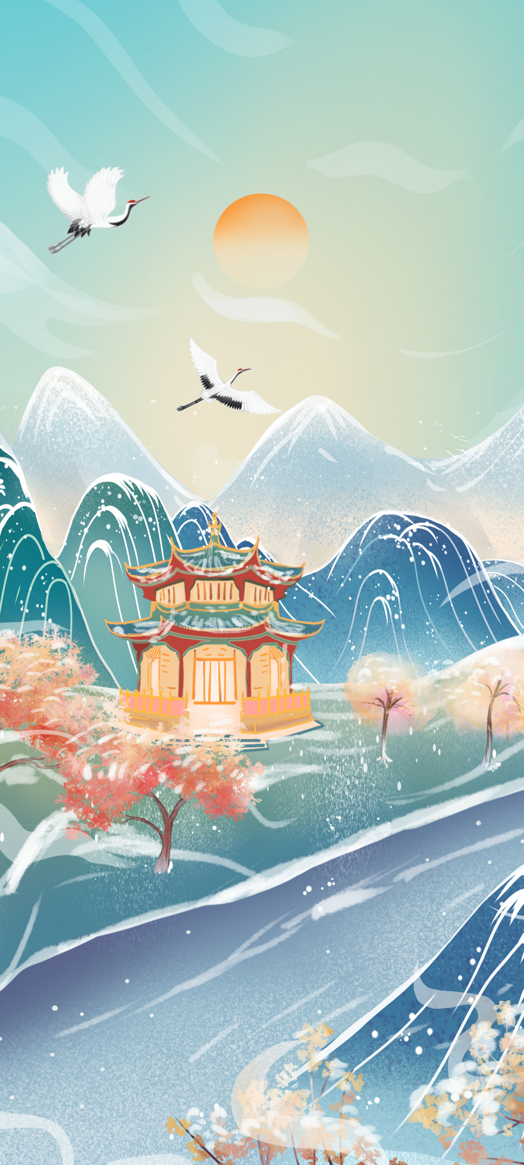 国风 山水 亭子 仙鹤 风景 手机 壁纸