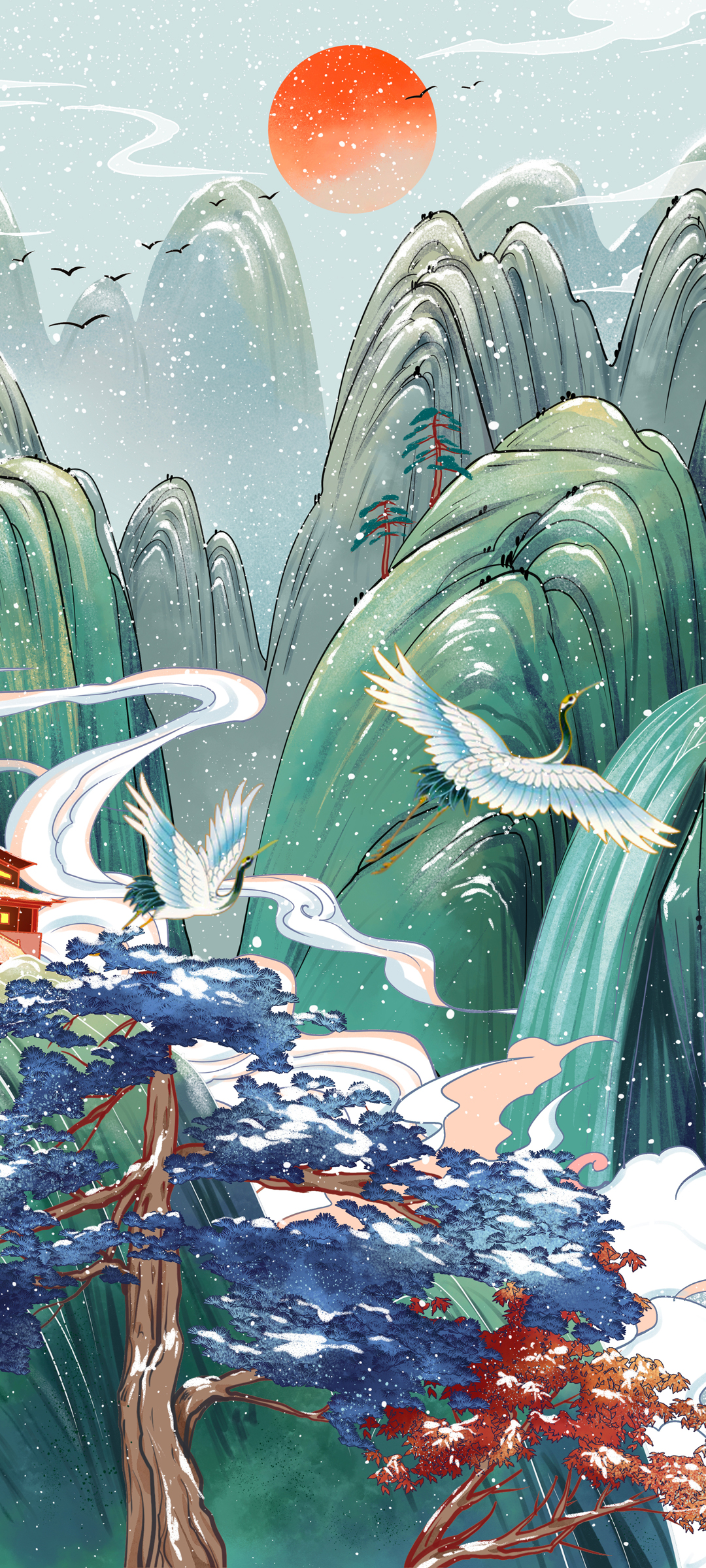 国风 山水风景 雪 山 仙鹤 树 手机 壁纸