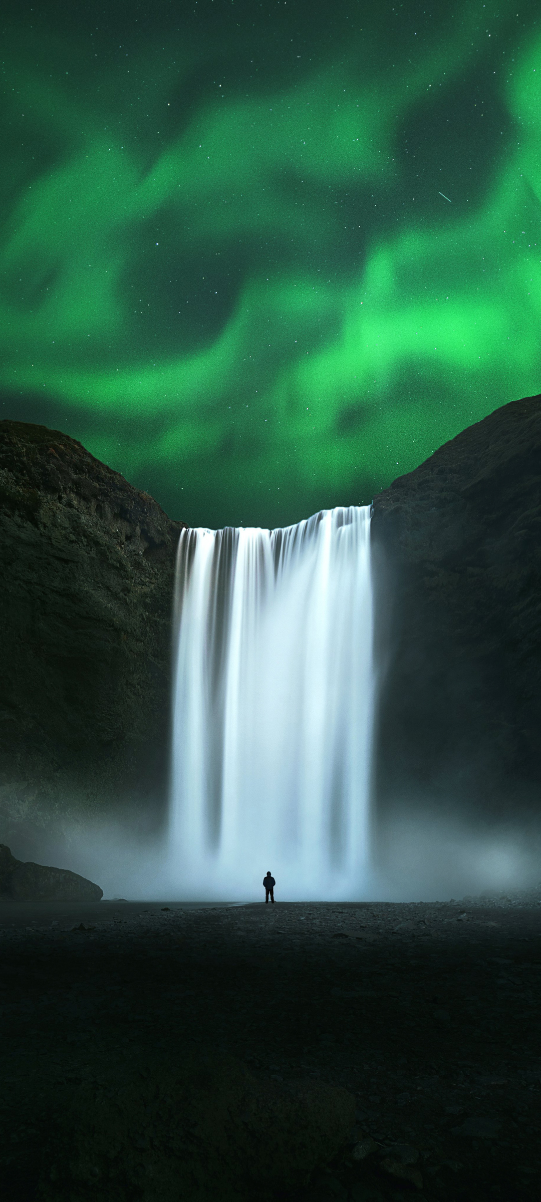 绿色极光瀑布与一人绝美风景免费手机壁纸下载