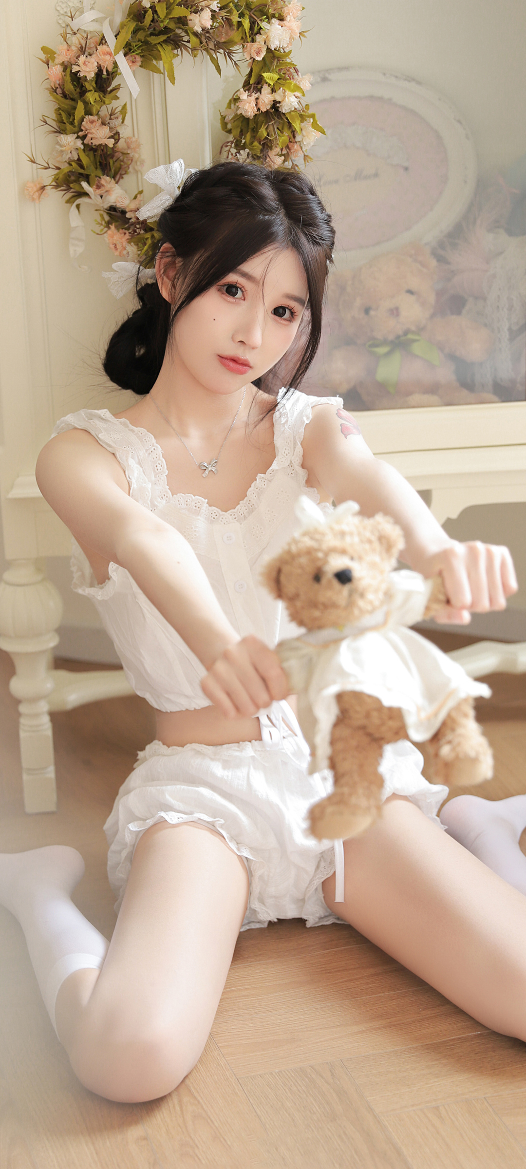 居家可爱清纯美女与毛绒玩具熊手机壁纸免费下载