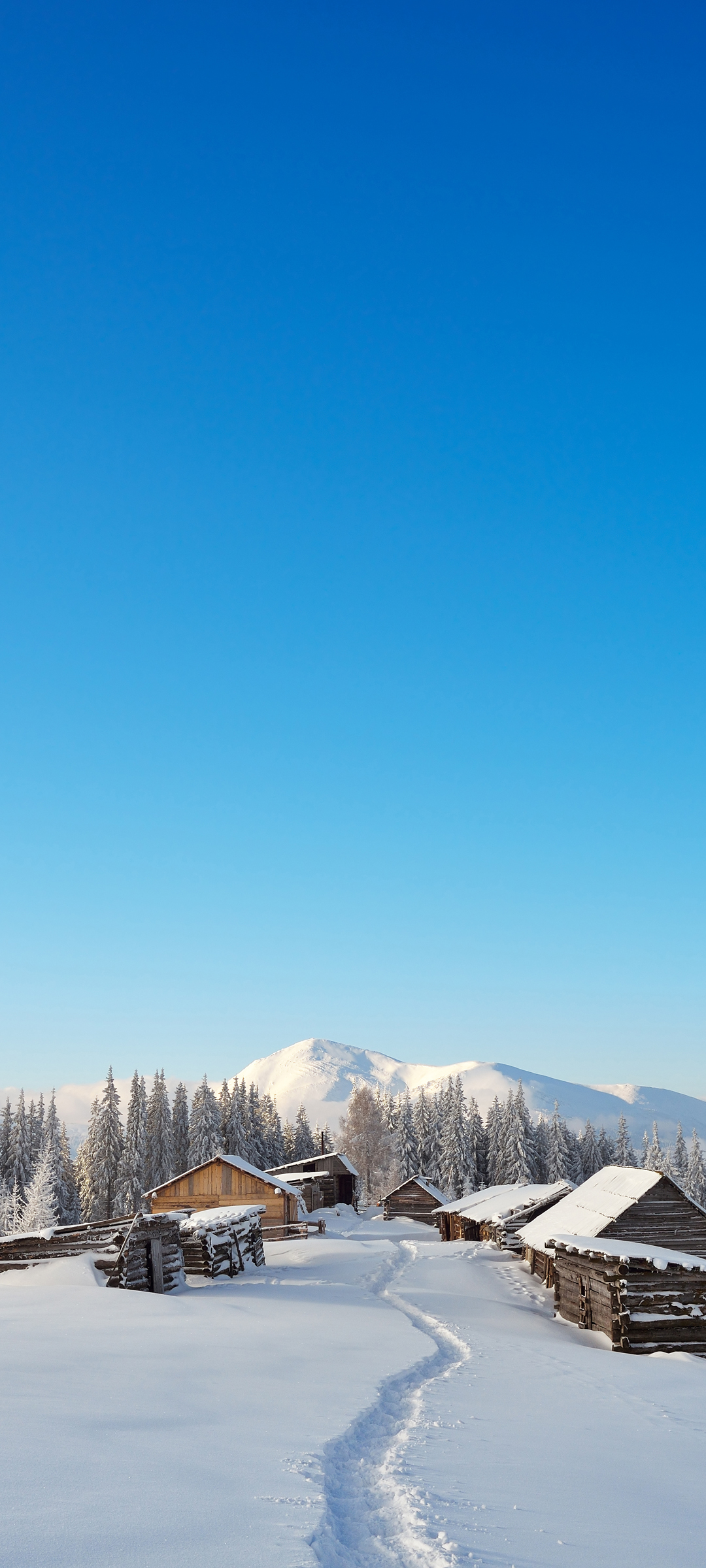 冬天 雪地 脚印 小木屋 树林 雪山 风景 手机 壁纸