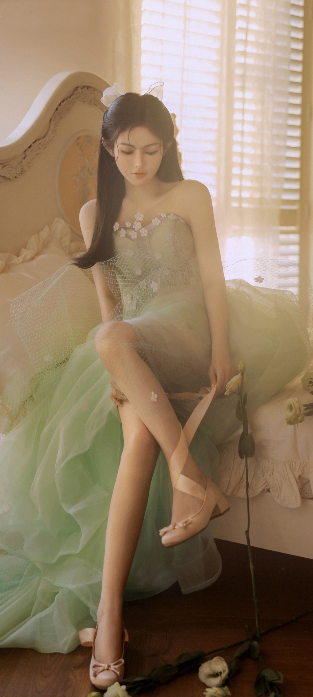 居家 公主 床 美女 绿色裙子 小清新 手机壁纸