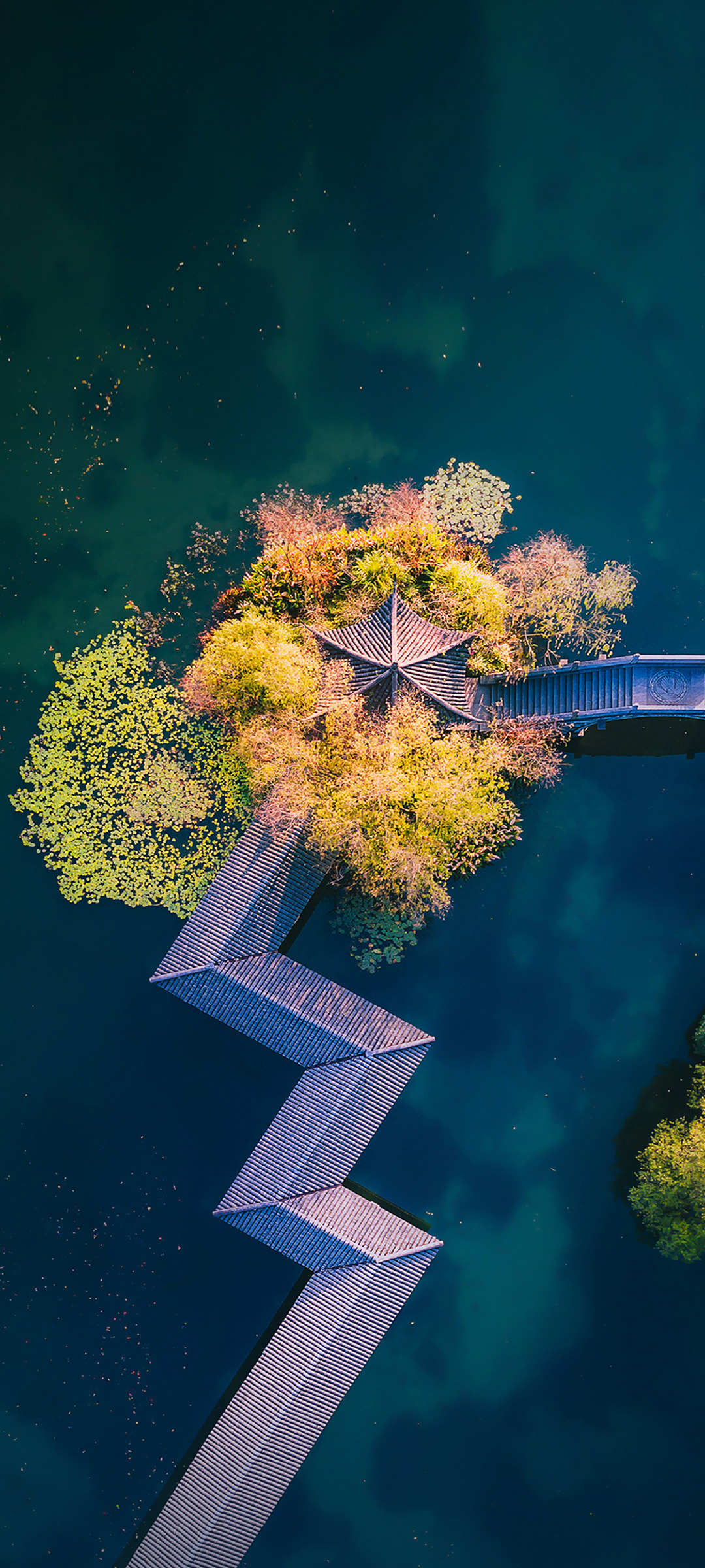 俯视视角下湖畔亭子树与桥的绝美风景手机壁纸免费下载