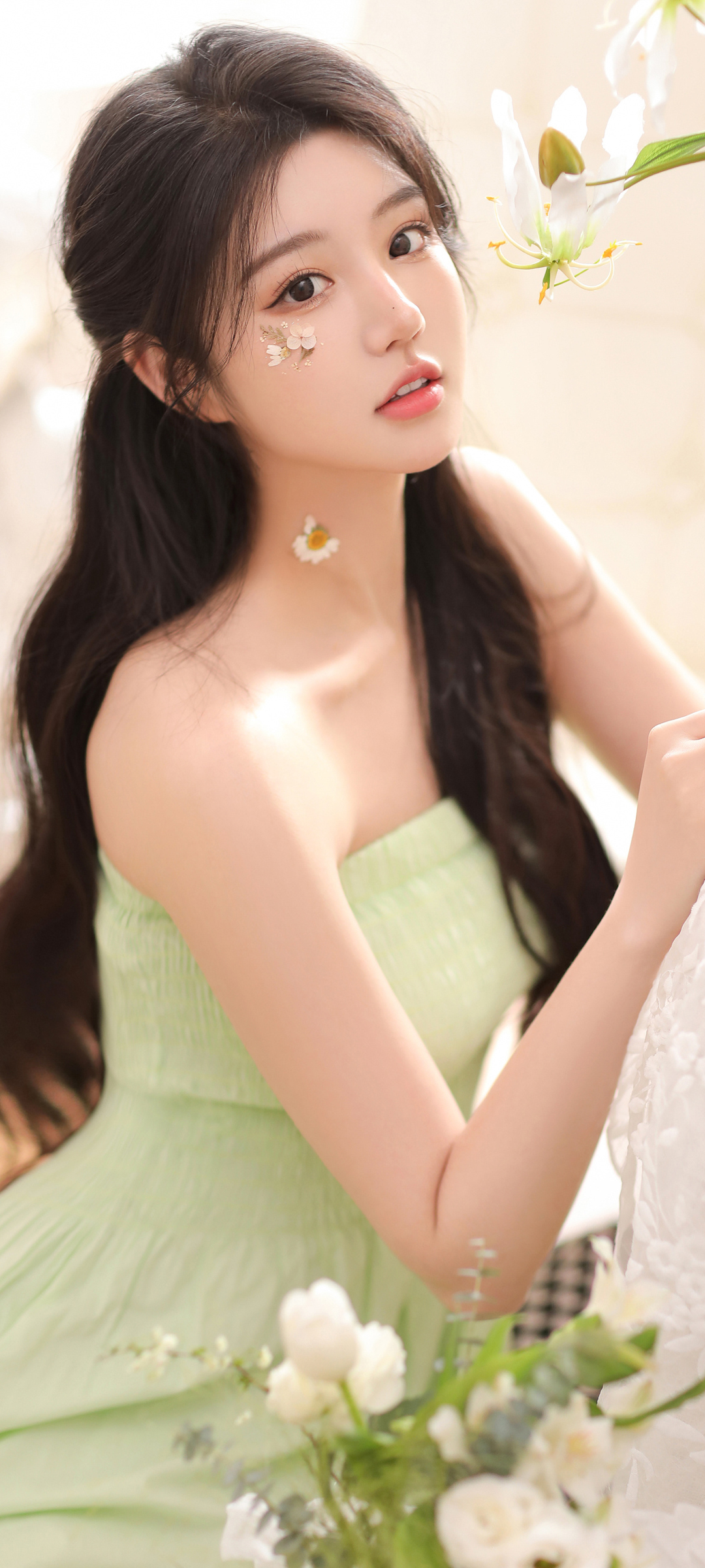 绿色裙子清新可爱美女 花 手机壁纸图片