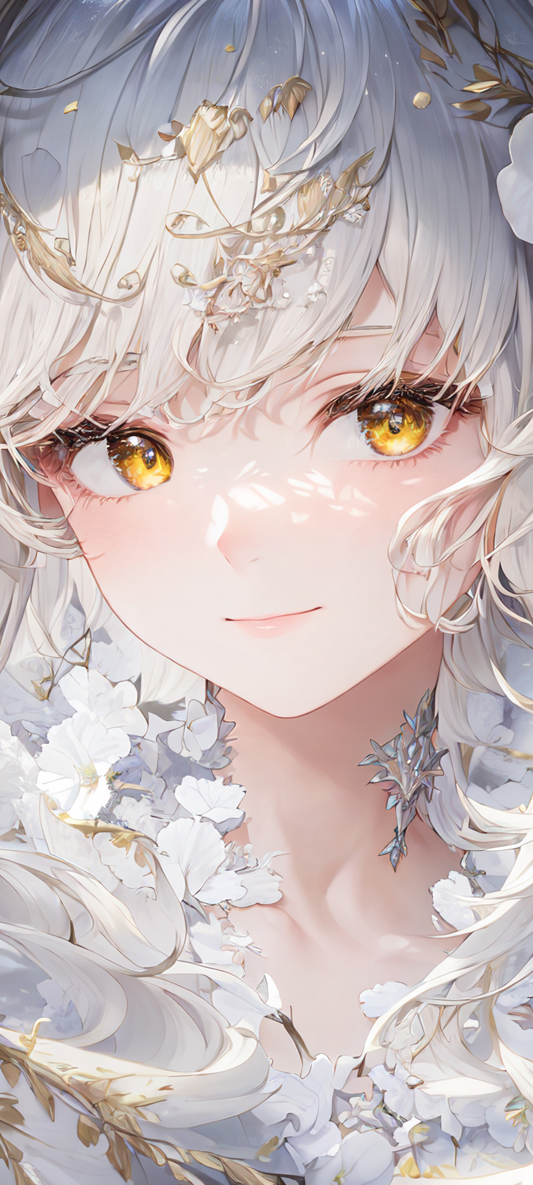 黄眼睛动漫女孩 白色头发 花 手机壁纸