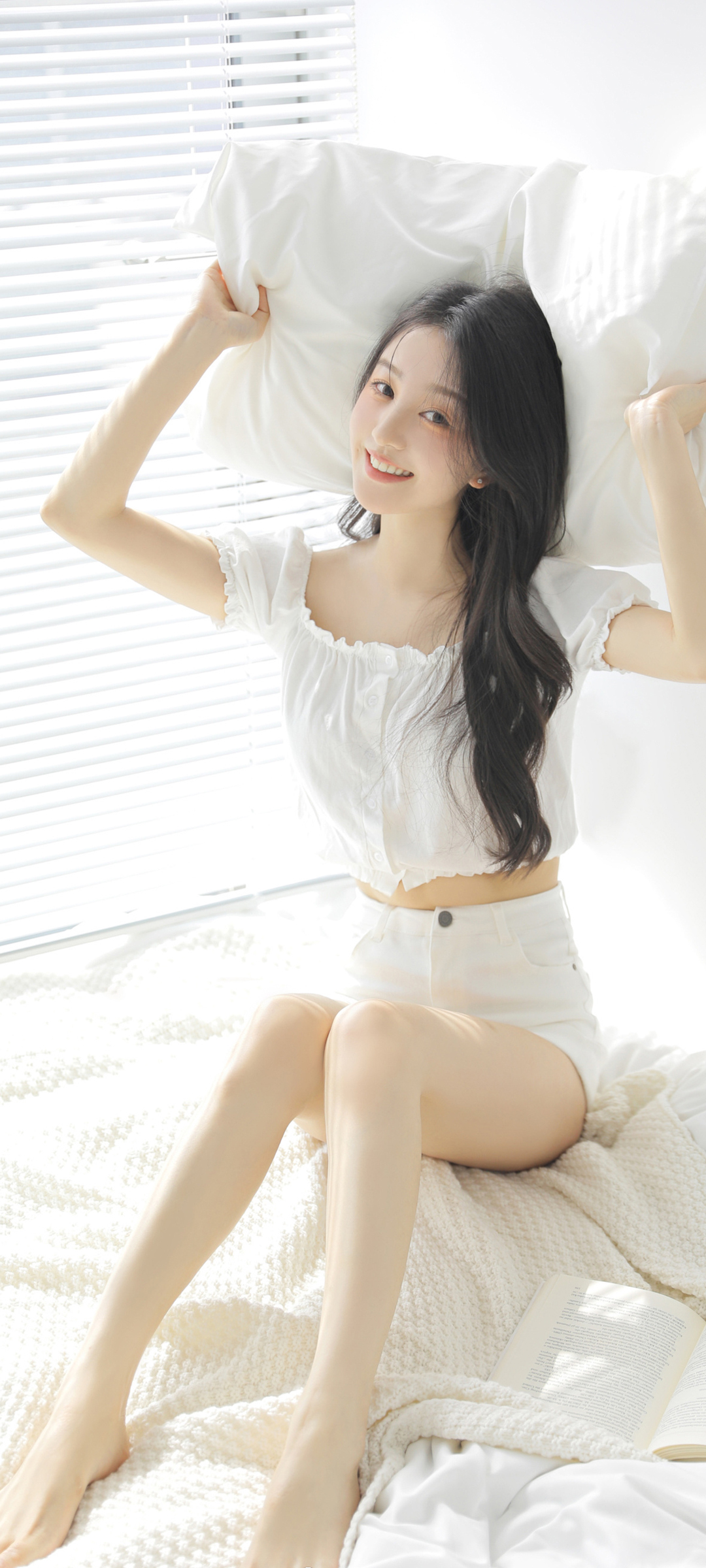居家美女 床 枕头 白色短裙美腿美女手机壁纸