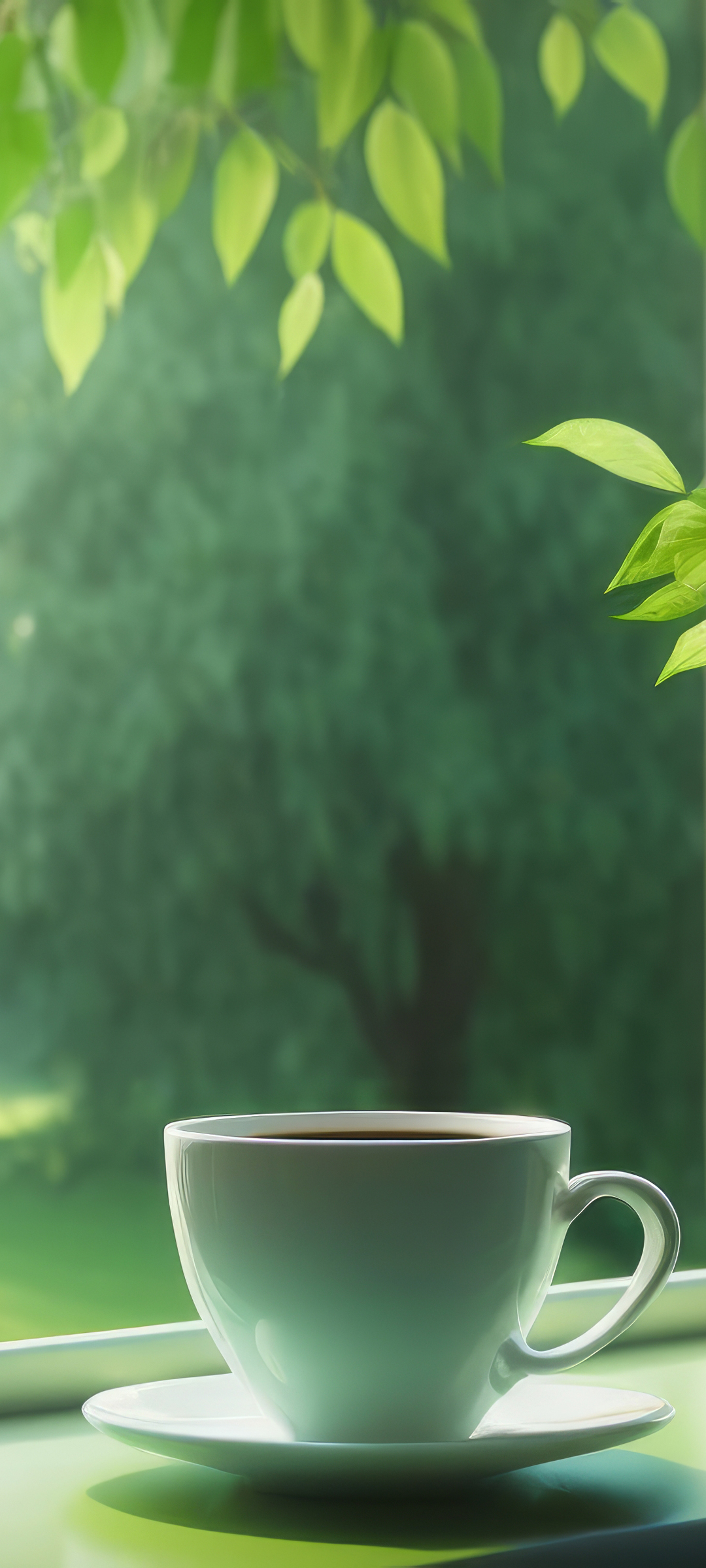 居家咖啡氛围配绿色树叶护眼风景手机壁纸免费下载
