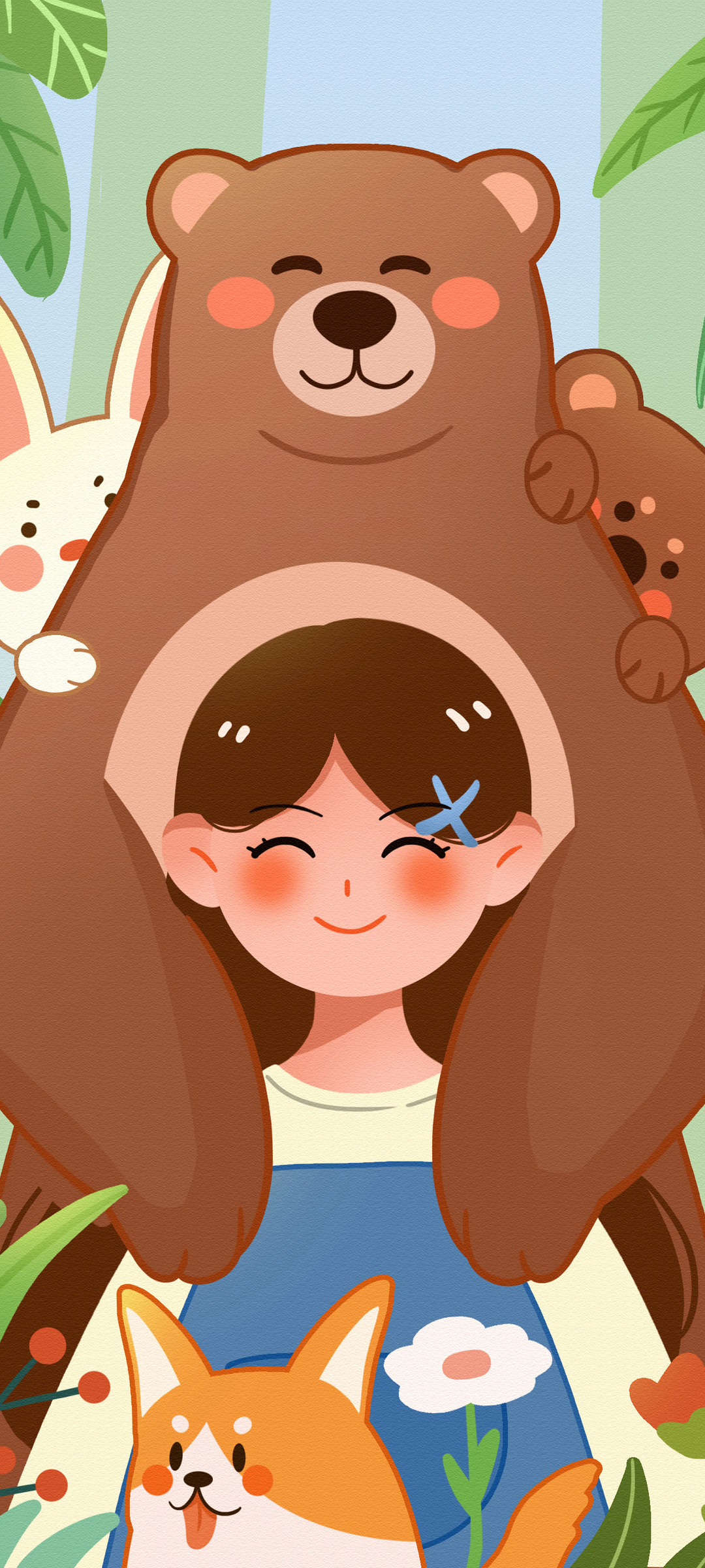 可爱女生与小熊小兔子小狗鲜花主题插画手机壁纸免费下载