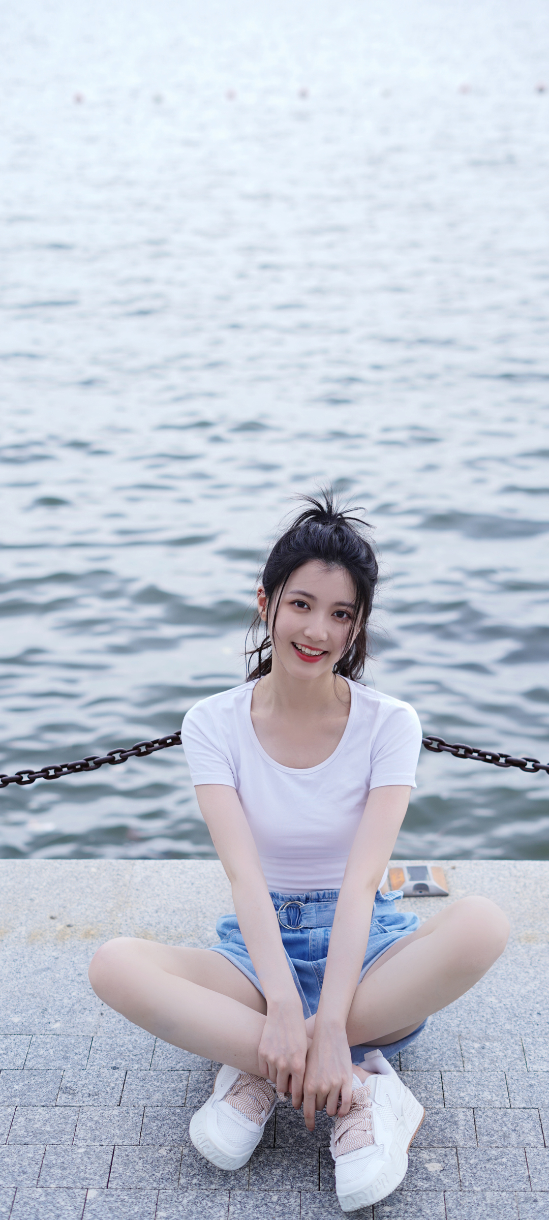 盘腿坐姿可爱微笑美女手机壁纸 免费高清下载