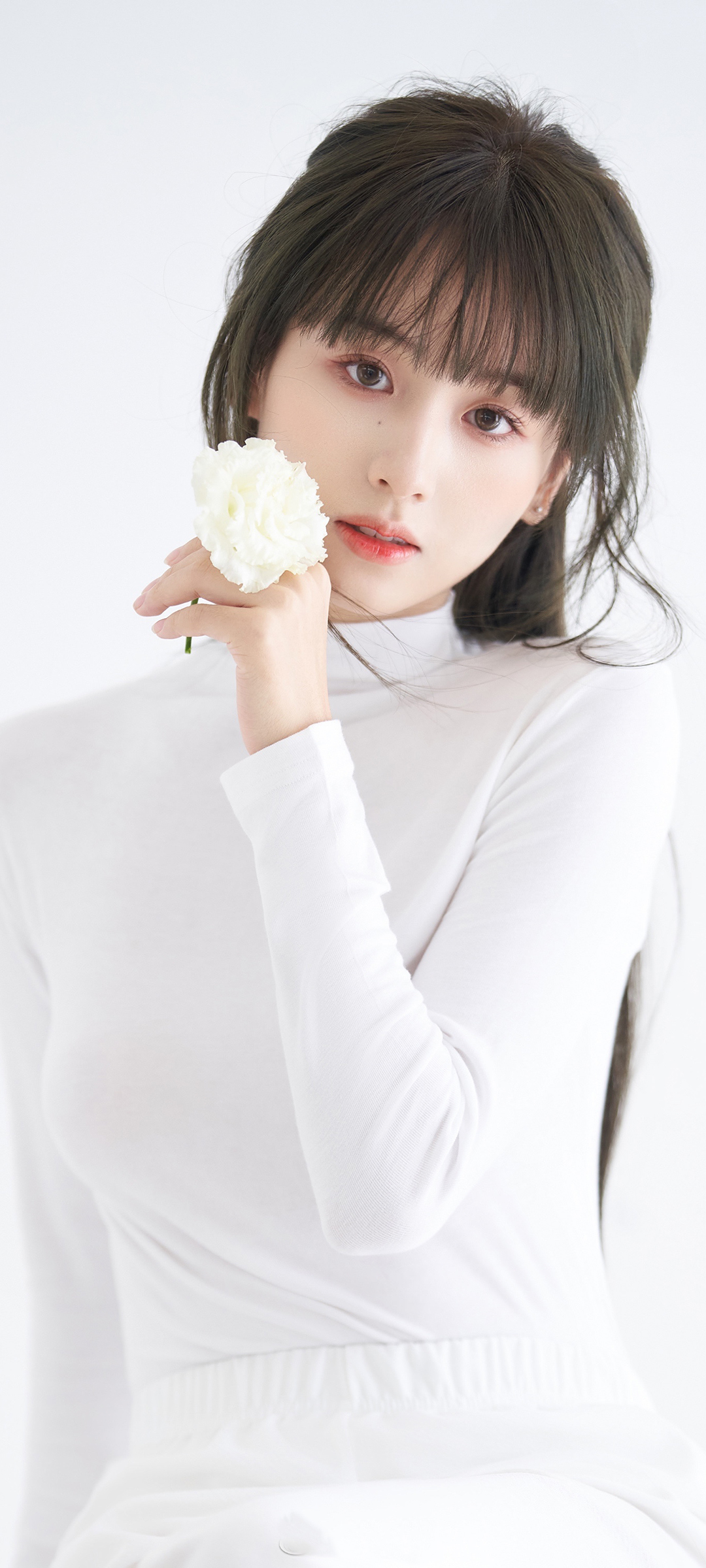 美女白色衣服配花朵全屏手机壁纸免费下载