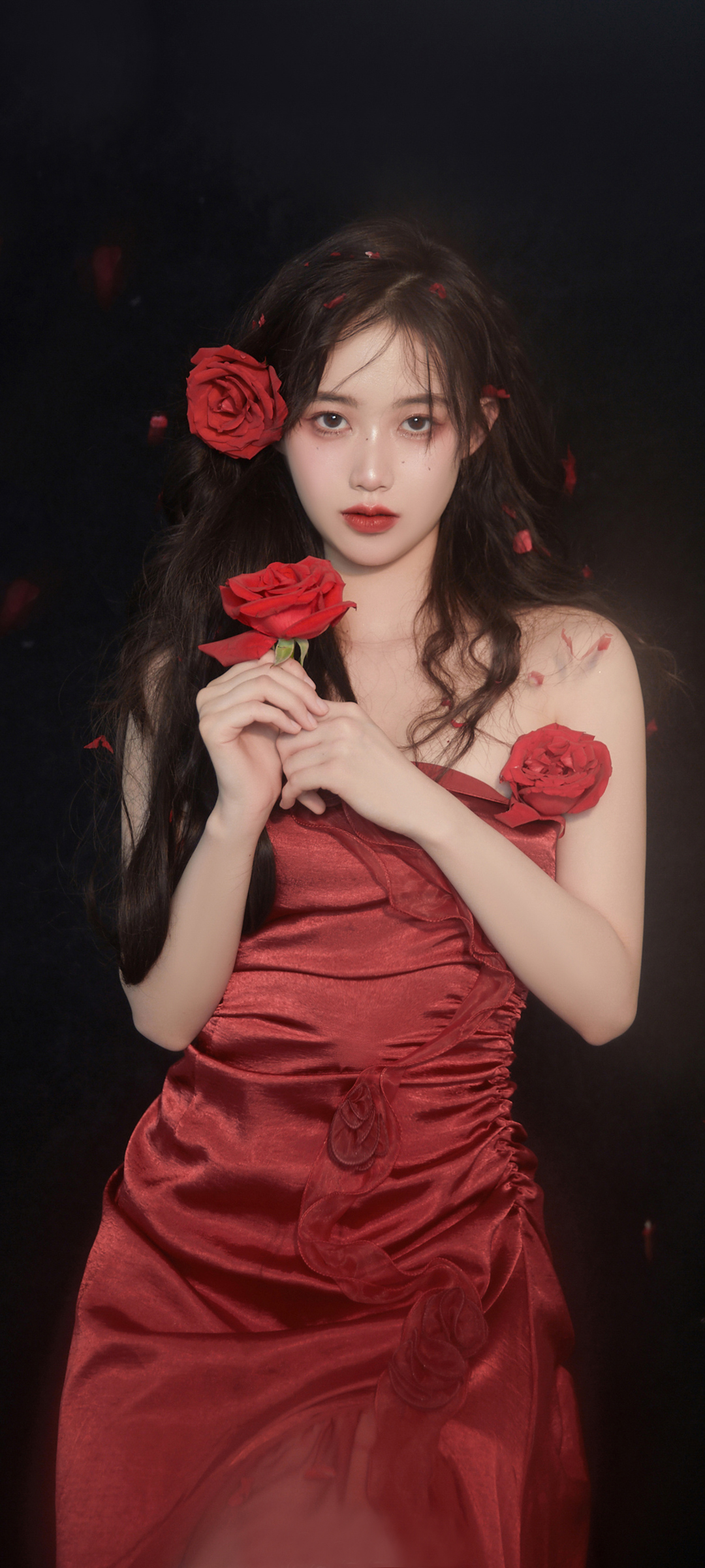 红色裙子礼服 玫瑰花 美女手机壁纸