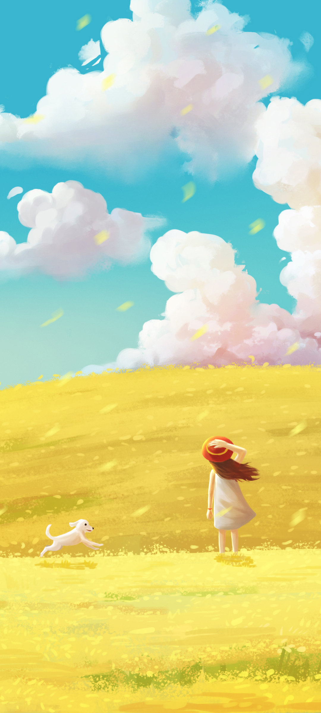 小女孩与小狗草地嬉戏 天空云朵动漫手机壁纸免费下载