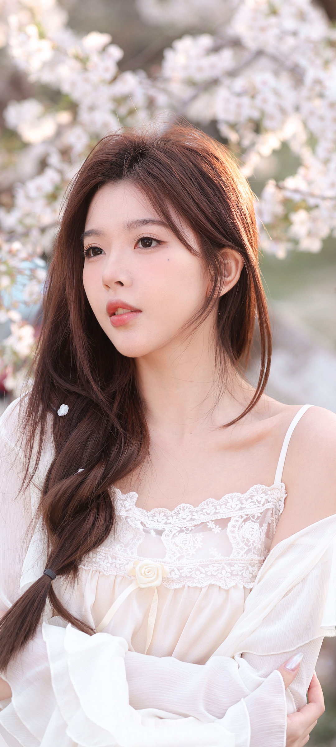 彭十六白色裙子樱花主题高清美女手机壁纸免费下载