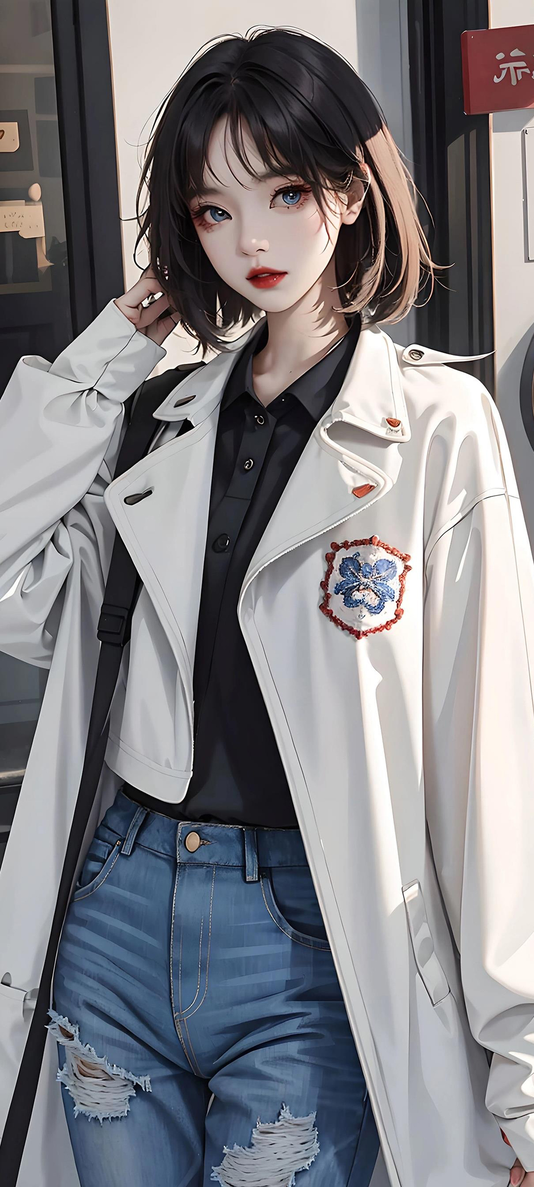 短发动漫美女 白色外套 牛仔长裤 手机壁纸