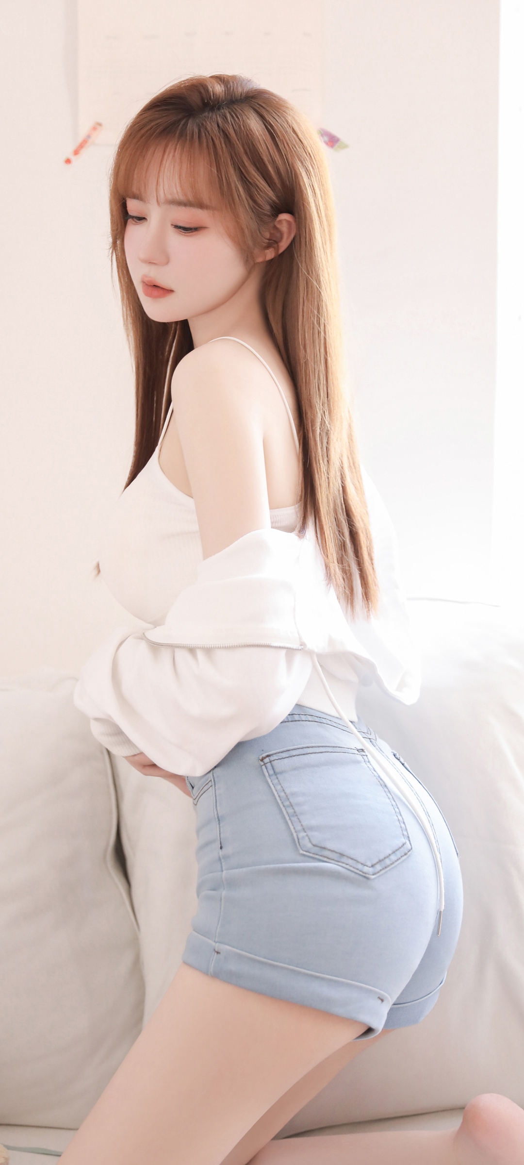 居家 牛仔短裤 美女 全屏手机壁纸