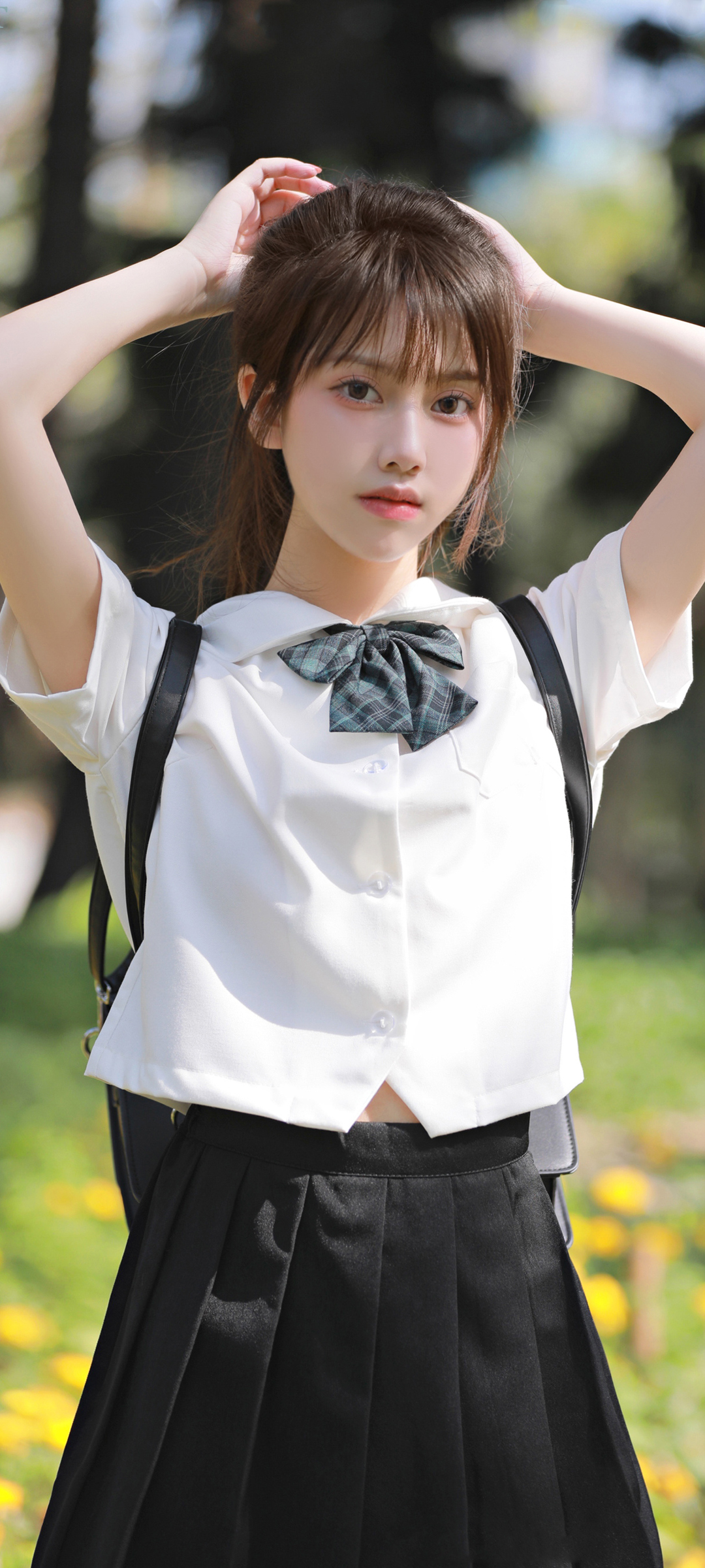 清纯美女 白色衬衫 黑色百褶裙 美女手机壁纸