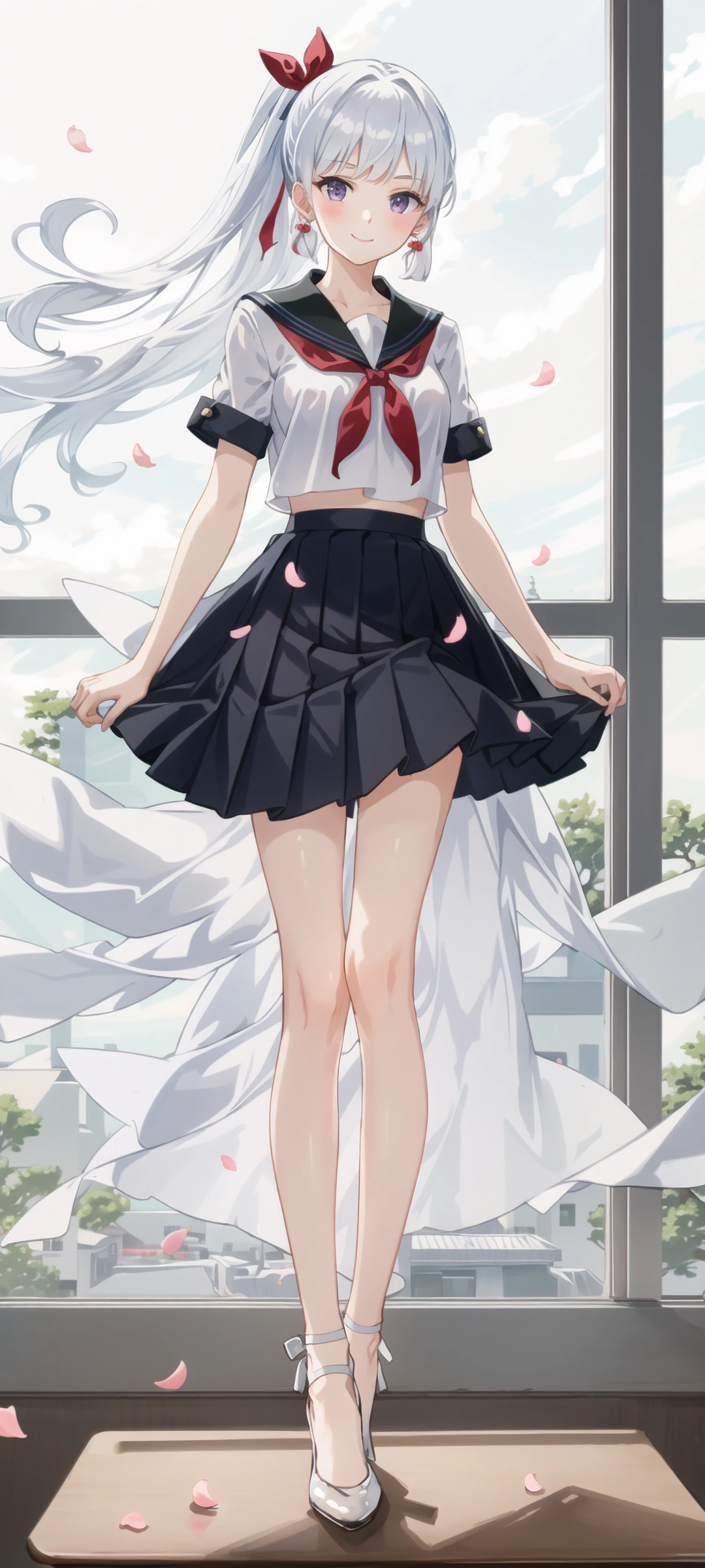动漫女孩高清免费手机壁纸,微笑长发马尾辫女学生水手服百褶裙款