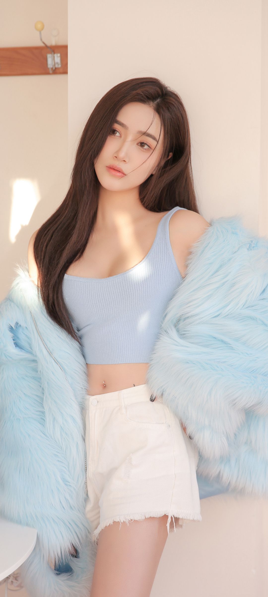 蓝色毛衣长发养眼美女全屏免费手机壁纸下载