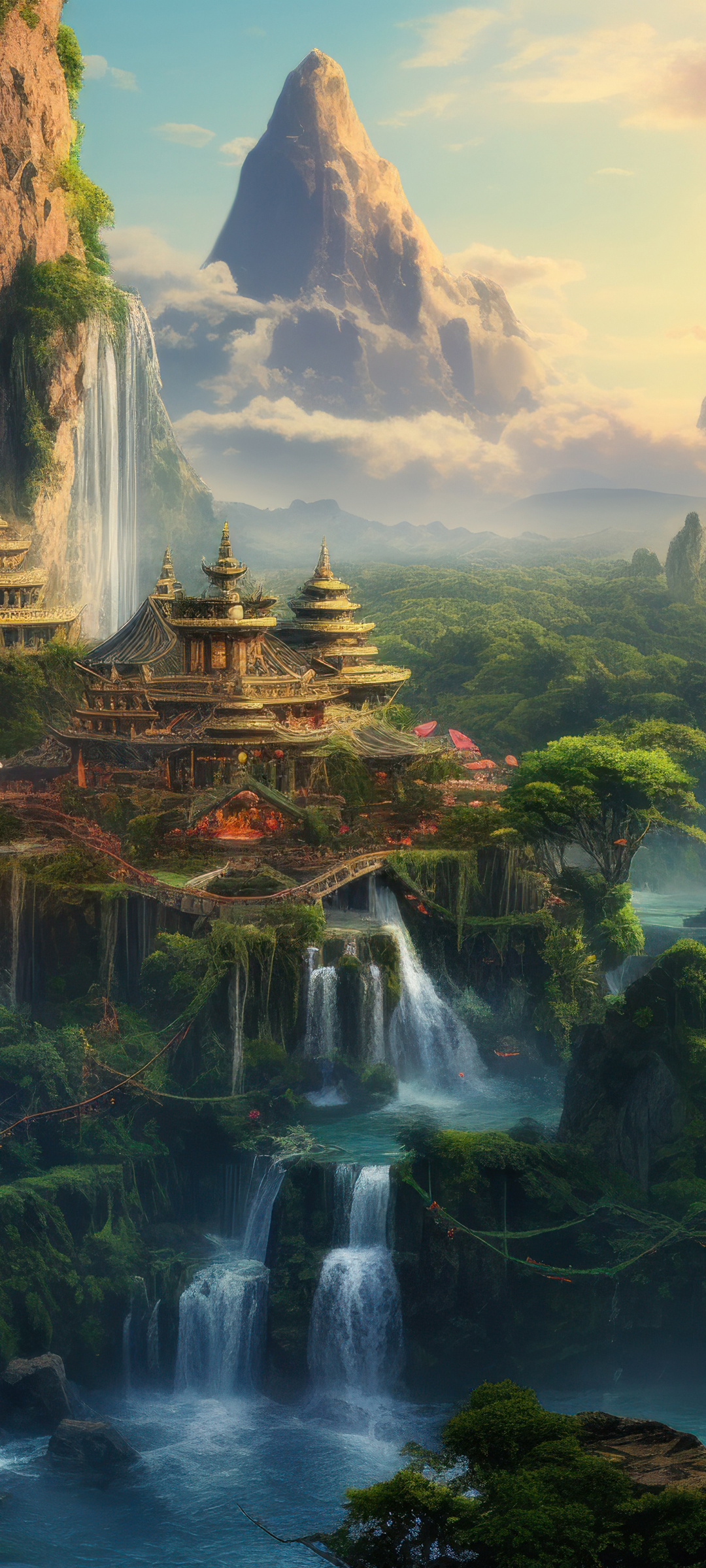 梦幻风景 高山 寺庙 瀑布 手机壁纸
