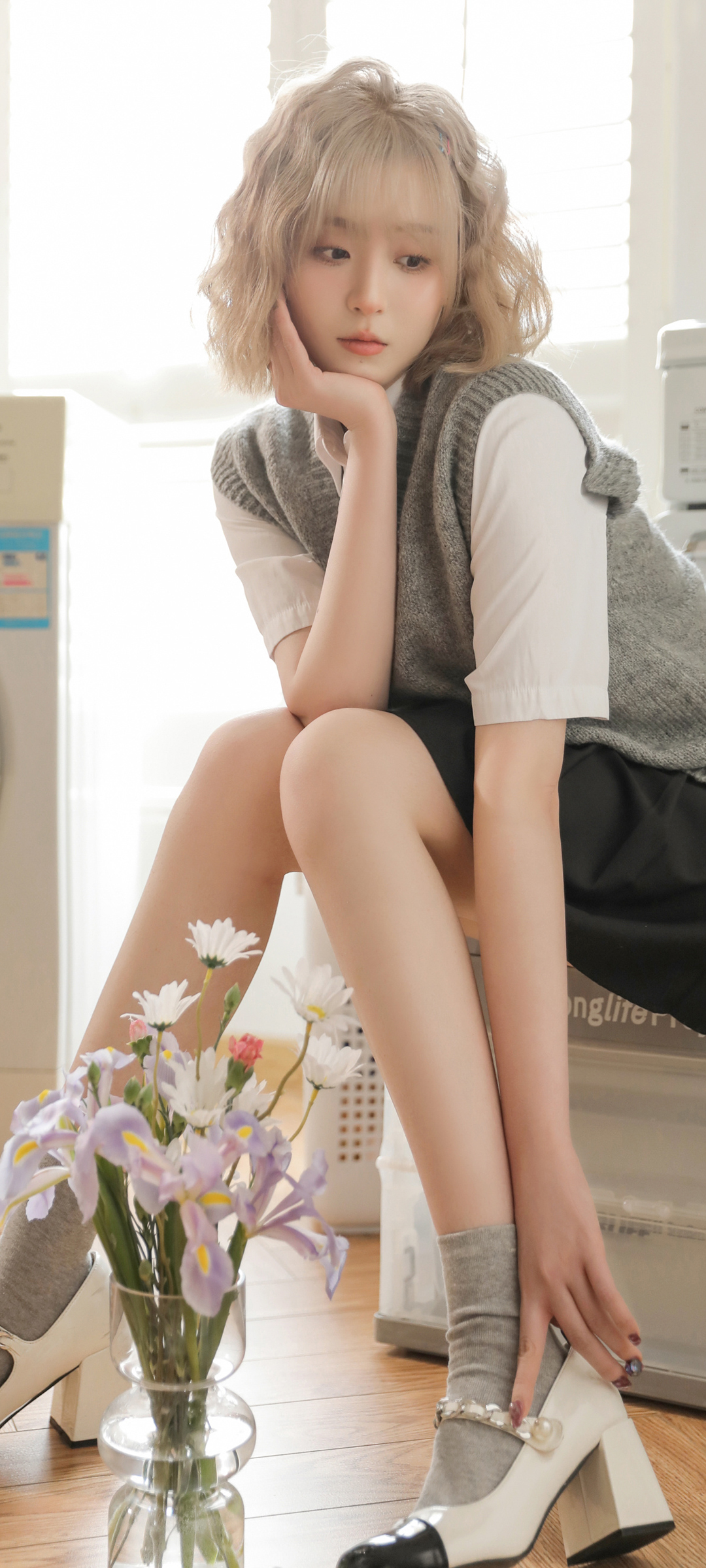 短发居家美女鲜花手机壁纸