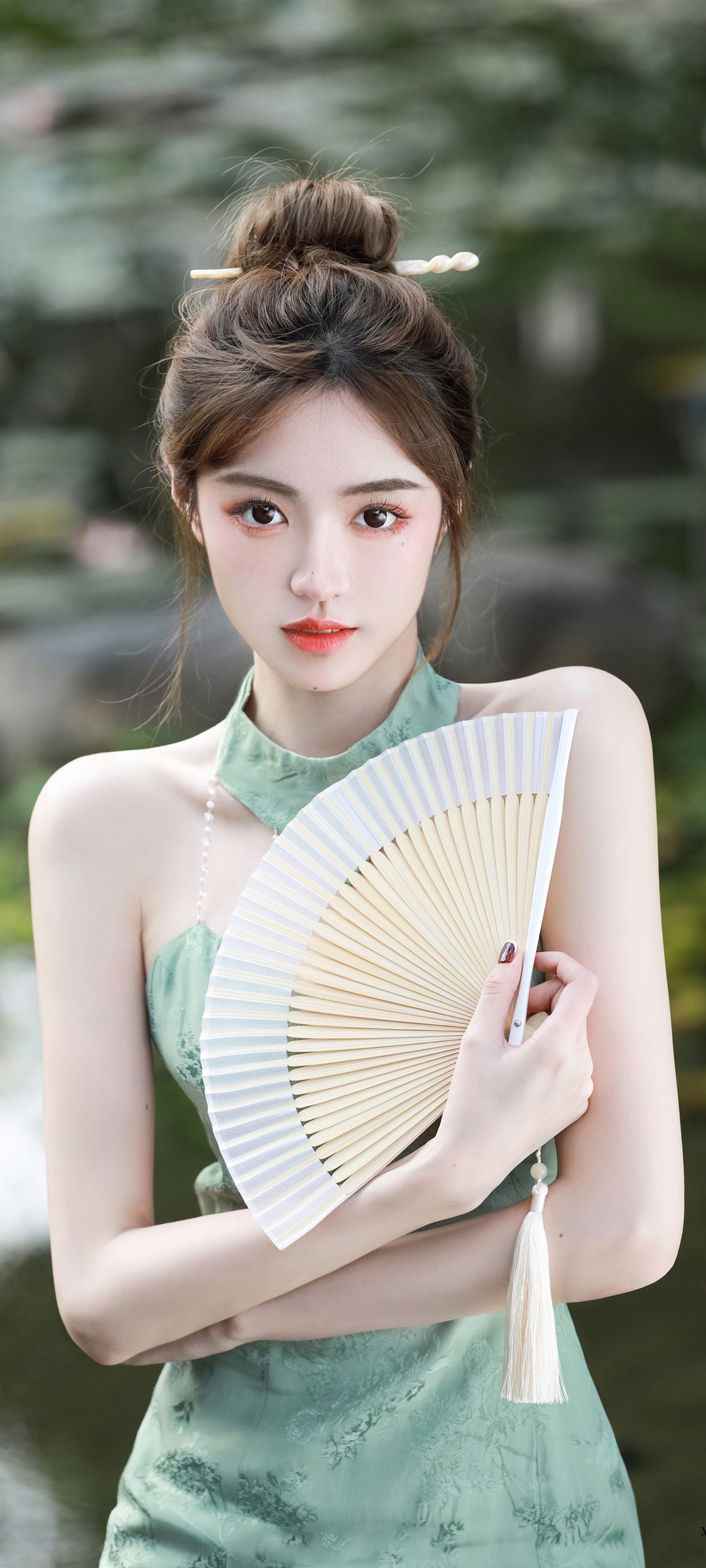 鹿醒美女穿绿色裙子持扇子手机壁纸免费下载