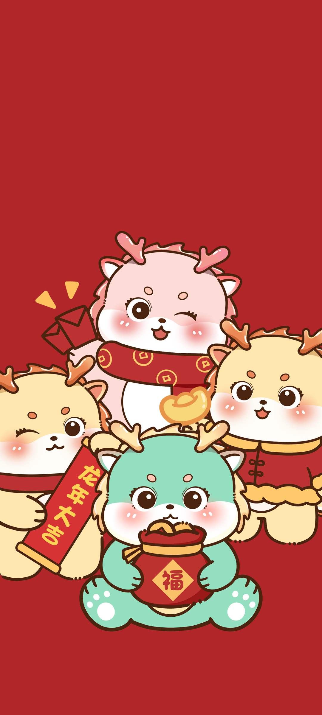 2024龙年大吉红色喜庆四只可爱小龙新年高清手机壁纸免费下载