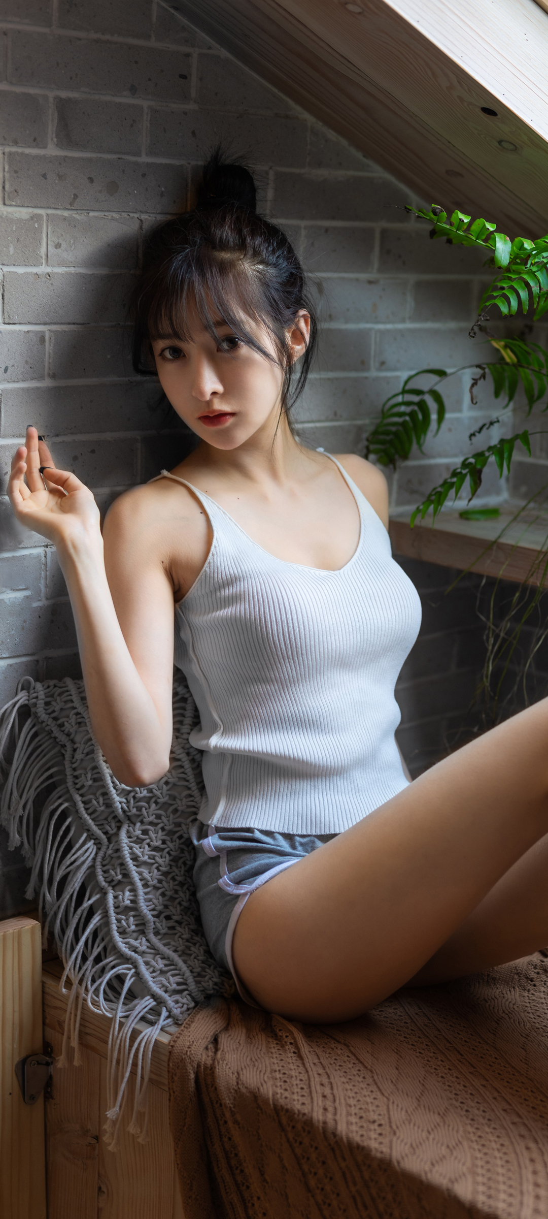 居家文艺美女 白色睡衣 短裤美女手机壁纸