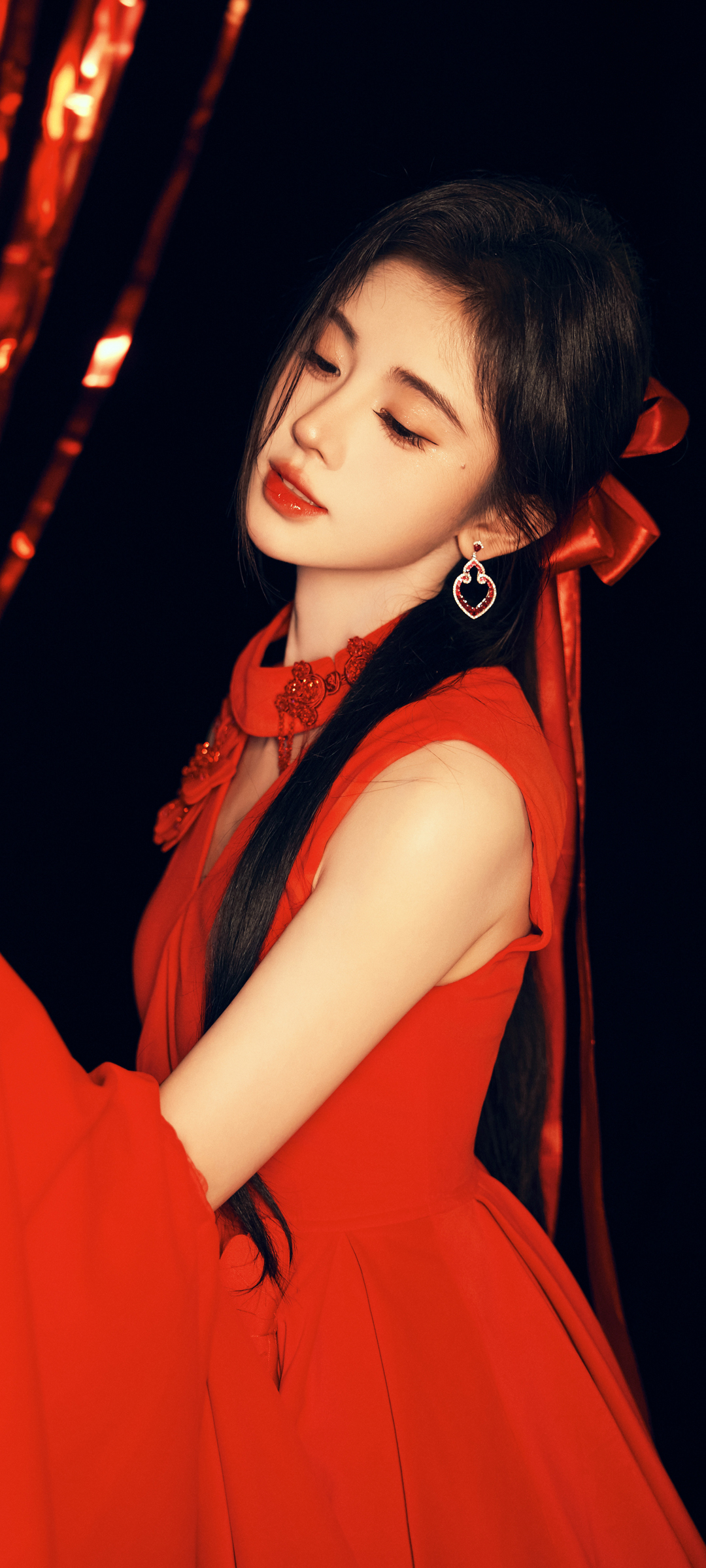 鞠婧祎新年红色裙子漂亮造型高清手机壁纸免费下载